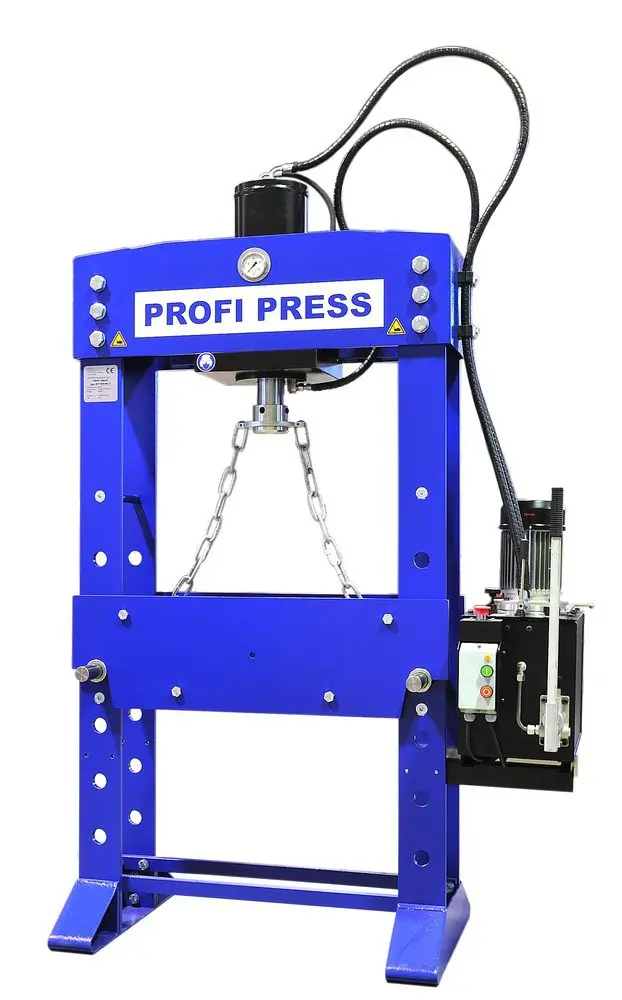Masivní dílenský hydraulický lis, vyráběný v Holandsku, s elektrickým i ručním pohonem k profesionálnímu použití s pevně umístěným tlačným válcem