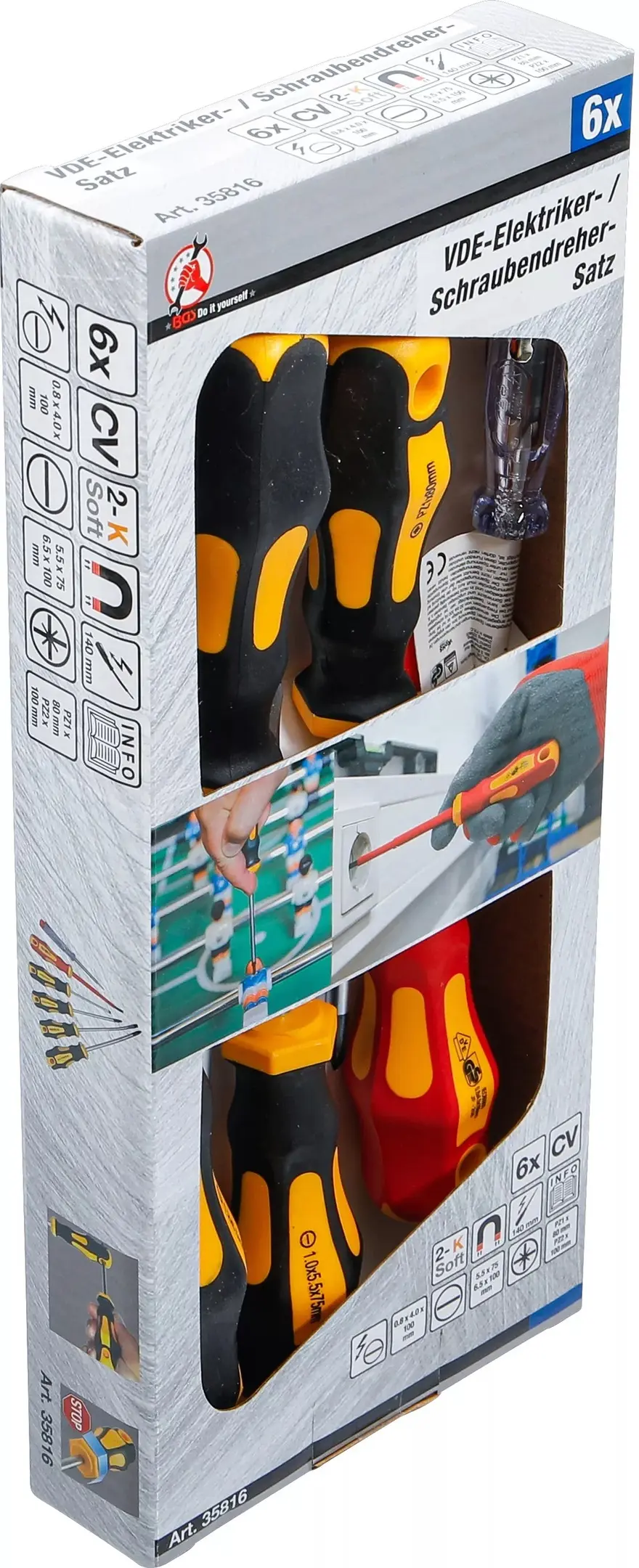 Sada šroubováků Kraftmann BGS1035816 obsahuje 6 kusů plochých a křížových nástrojů s VDE certifikací pro práci pod napětím do 1000 V. Ergonomické rukojeti zajišťují pevný úchop při montážích i opravách.