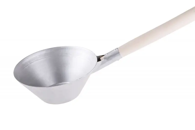 Hlava vejára je vyrobená z pevného kovu, ktorý odoláva mechanickému namáhaniu pri práci s rôznymi typmi stavebných zmesí. Povrch je navrhnutý tak, aby sa materiál ľahko naberal a zároveň sa nelepil v rohoch, čo uľahčuje jeho údržbu a používanie.
