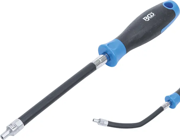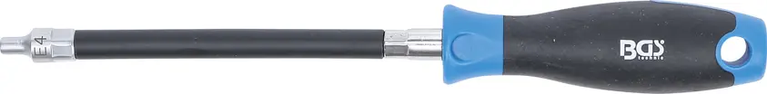 Kvalitní flexibilní šroubovák s nástrčnou hlavicí TORX (E-Profil E4) od firmy BGS technic s ohebnou čepelí (pružným dříkem) pro dosažení těžko přístupných míst. Určený pro hvězdicové matice a šrouby E4 s délkou šroubováku (dříku) 150 mm.