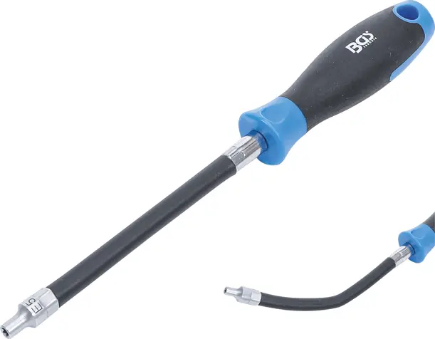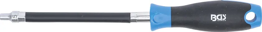 Kvalitní flexibilní šroubovák s nástrčnou hlavicí TORX (E-Profil E5) od firmy BGS technic s ohebnou čepelí (pružným dříkem) pro dosažení těžko přístupných míst. Určený pro hvězdicové matice a šrouby E5 s délkou šroubováku (dříku) 150 mm.