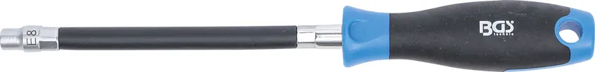 Kvalitní flexibilní šroubovák s nástrčnou hlavicí TORX (E-Profil E8) od firmy BGS technic s ohebnou čepelí (pružným dříkem) pro dosažení těžko přístupných míst. Určený pro hvězdicové matice a šrouby E8 s délkou šroubováku (dříku) 150 mm.