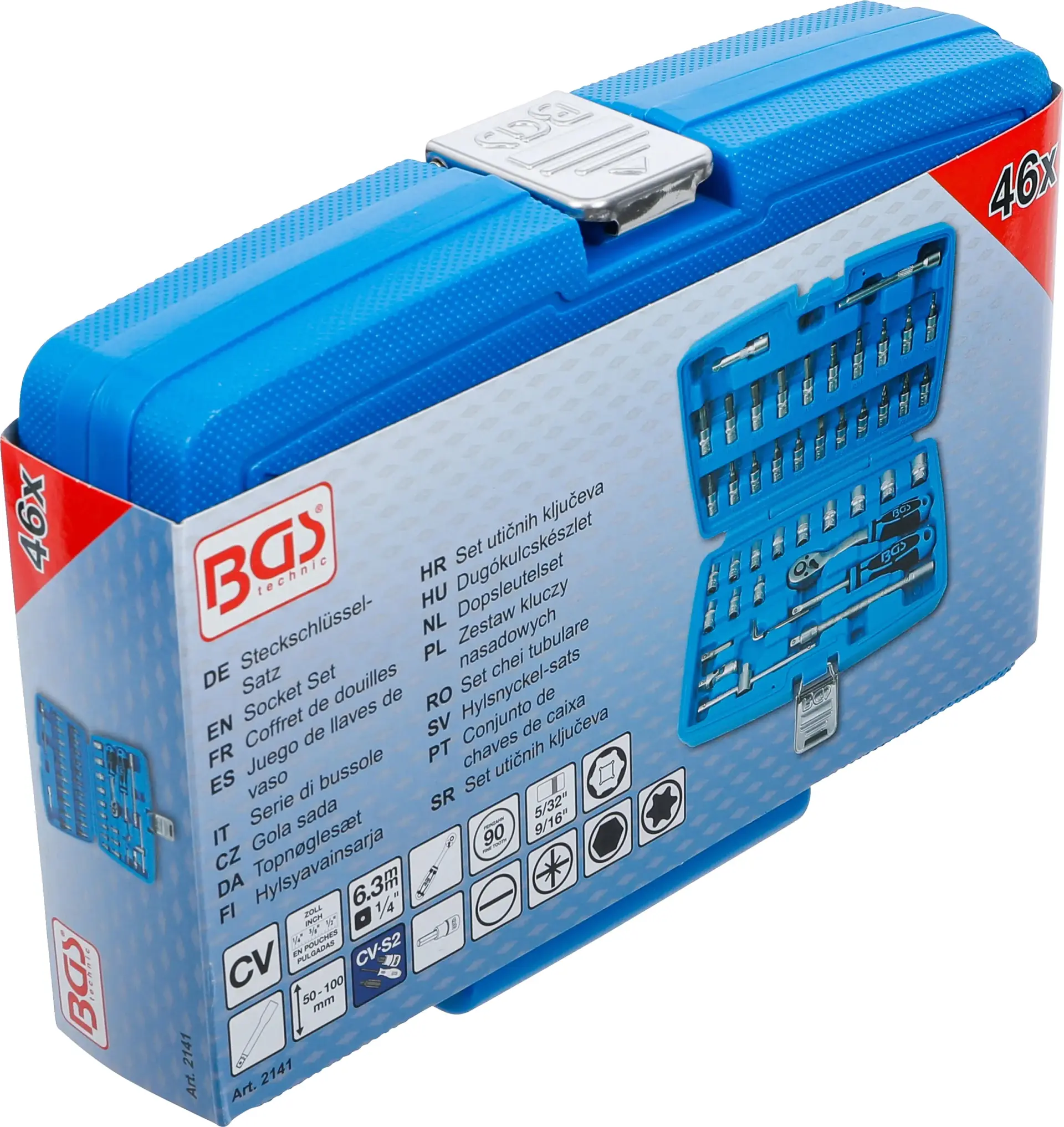 Gola sada 1/4" nemeckého výrobcu BGS technic. Súprava nástrčných hlavíc - palcové rozmery. Celá sada 46 ks v kombinácii chróm vanádia a matného chrómu. V plastovej kazete