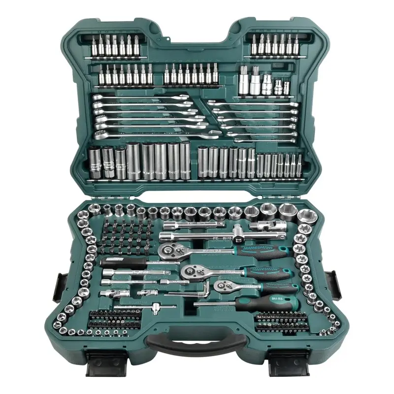 BRUDER MANNESMANN gola sada 98430 obsahuje 215 dílů, které pokrývají široké spektrum potřeb při montážních a opravárenských pracích. Sada je sestavena z hlavic, bitů a očkoplochých klíčů v rozměrech 1/4", 3/8" a 1/2", což umožňuje práci s různými typy spojovacích materiálů a šroubů.