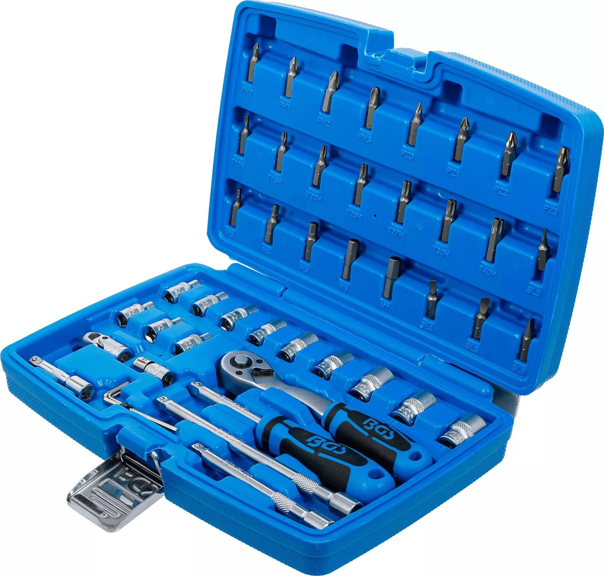 Gola sada 1/4" nemeckého výrobcu BGS technic. Súprava nástrčných hlavíc 4 ÷ 13 mm Super Lock,bity Torx, Inbus, plochý bit, PH a PZ.