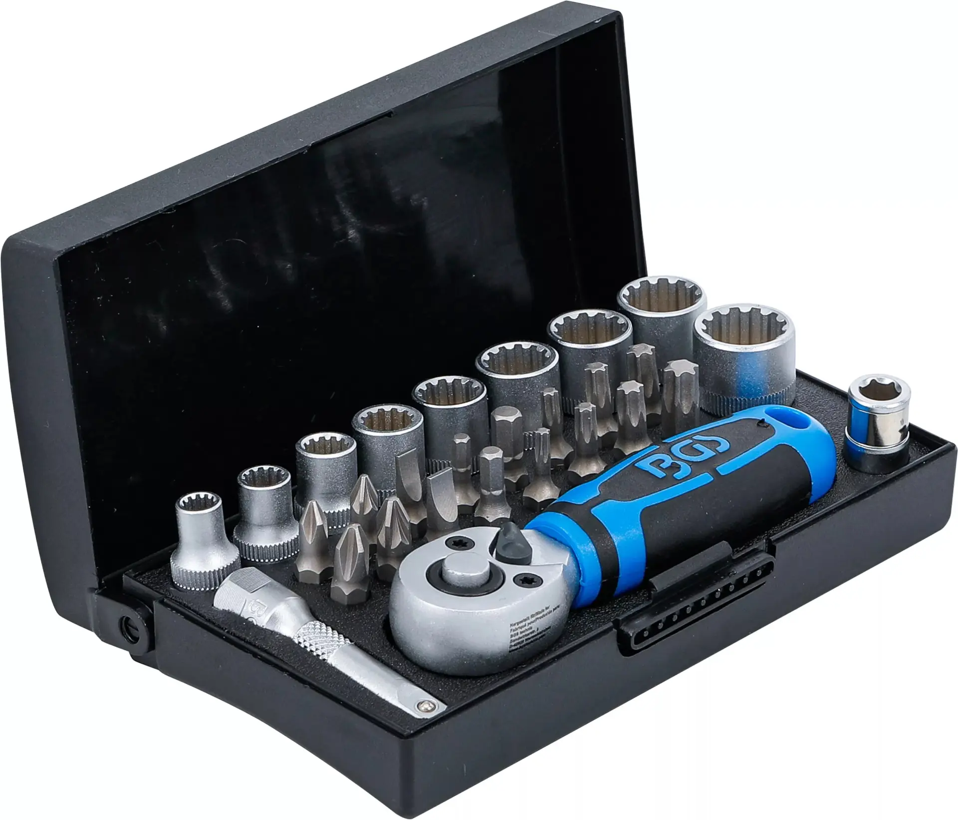 Gola sada 28 dielov s račňou 1/4" od nemeckého výrobcu BGS technic. Súprava nástrčných hlavíc, T-profil, plochý bit, PZ a PH. Celá sada v kombinácii chrómvanádia a matného chrómu.