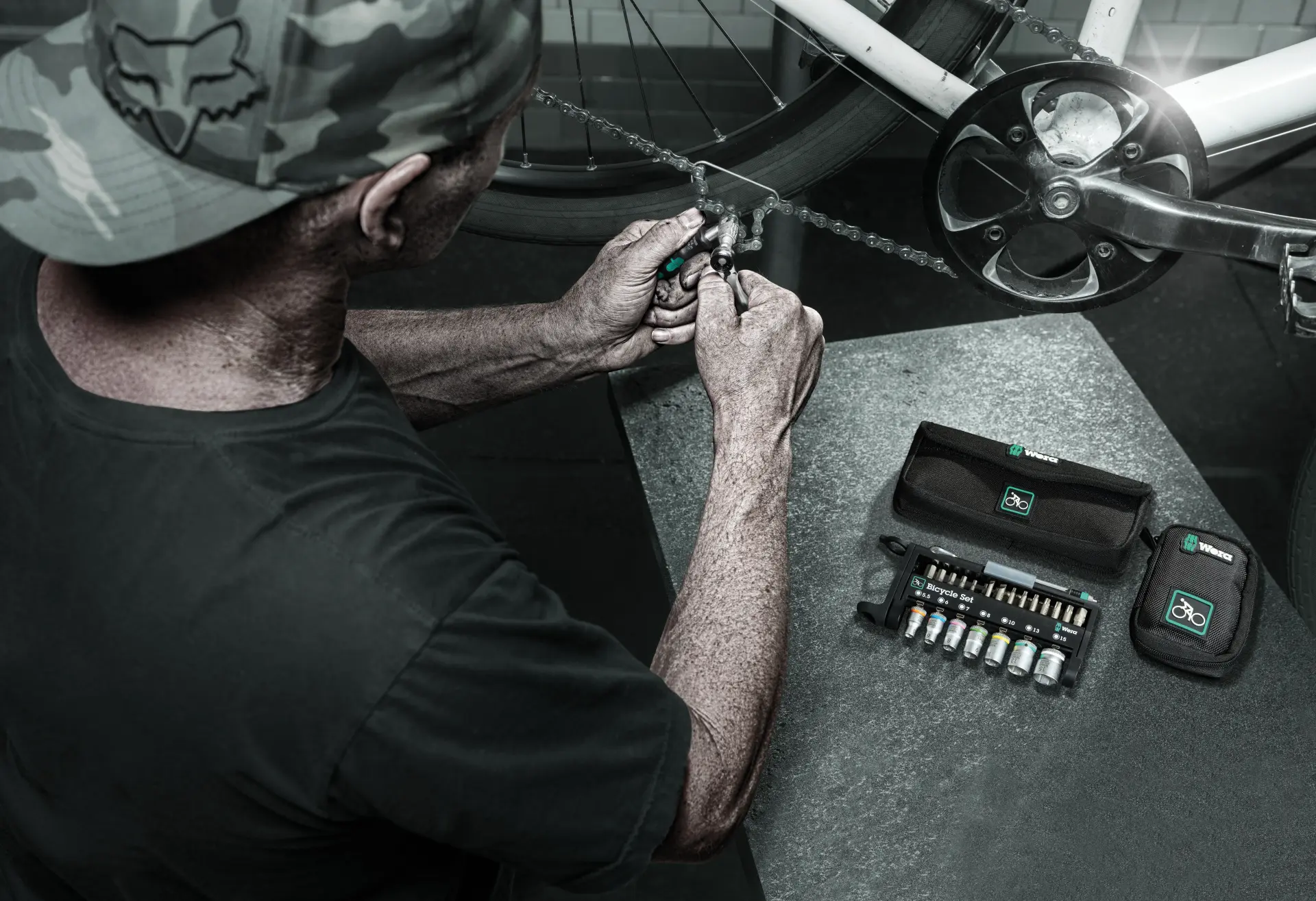 S praktickým náradím na reťaze (nitovač a držiak reťaze) na opravu reťazí bicyklov