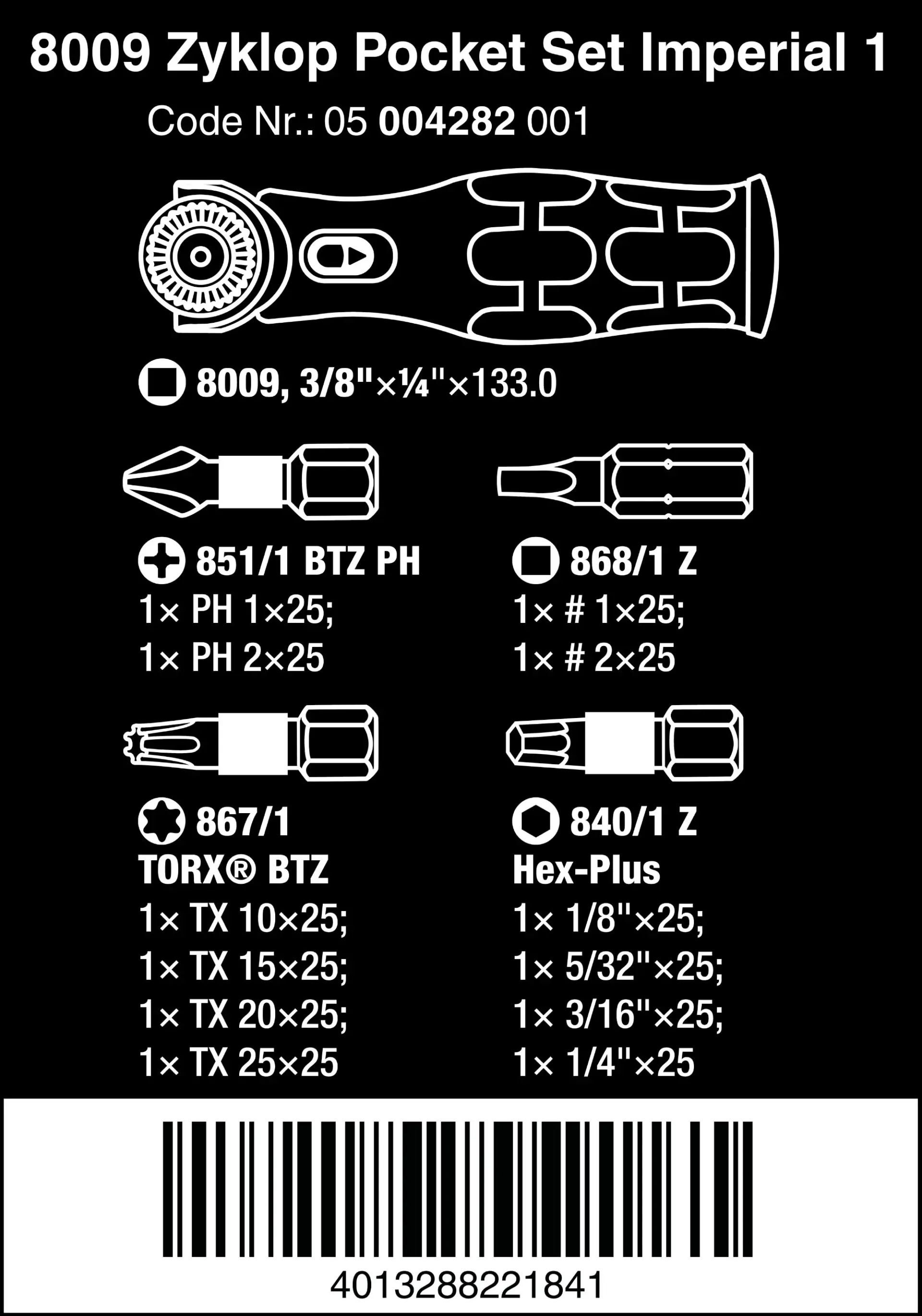 Wera 004282 Kompaktná račňa 8009 Zyklop Pocket Imperial Set 1 so skrutkovacími bitmi (Palcová sada 13 dielov) (W05004282001)