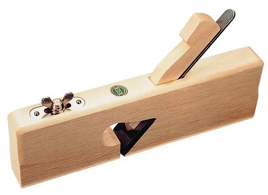Dvojitý římsovníkový hoblík Prevedenie: Z habrového dreva, lakovaný, s prestaviteľnou spodnou plochou, ako aj s hoblíkovým nožom hotovým na použitie. S rezným uhlom 50°.