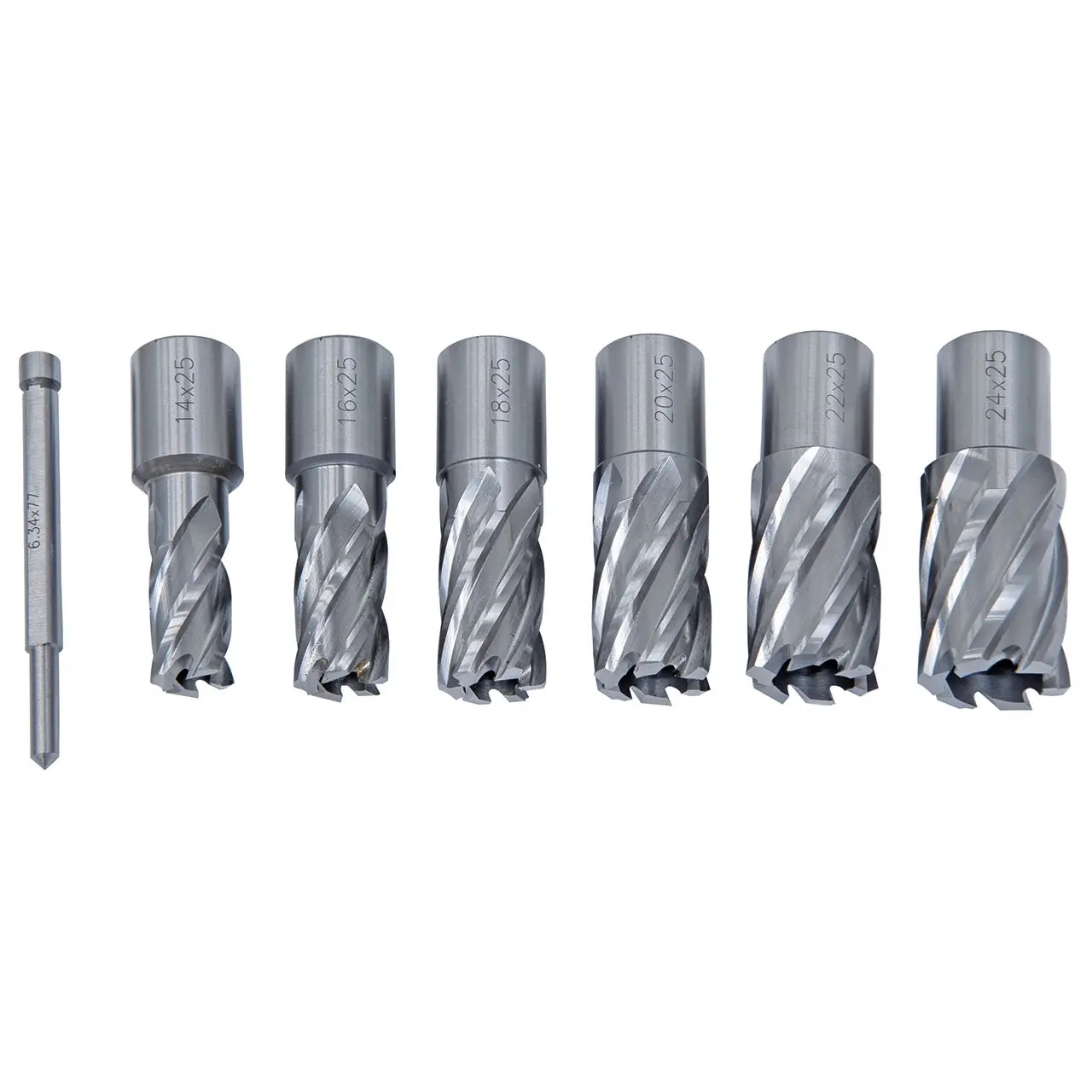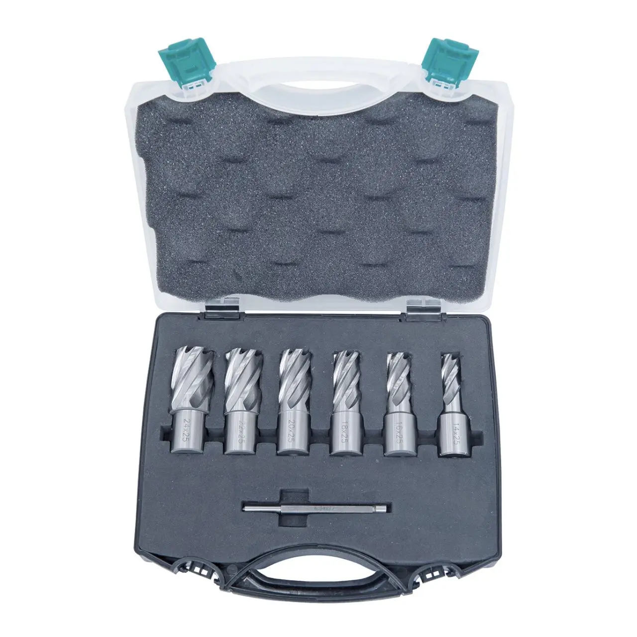 Sada sedmi jádrových vrtáků Bernardo HSS s průměry 14–24 mm a hloubkou vrtání 25 mm je určena pro přesné a rychlé vrtání do kovu. Vhodné pro použití se standardními držáky CDS.