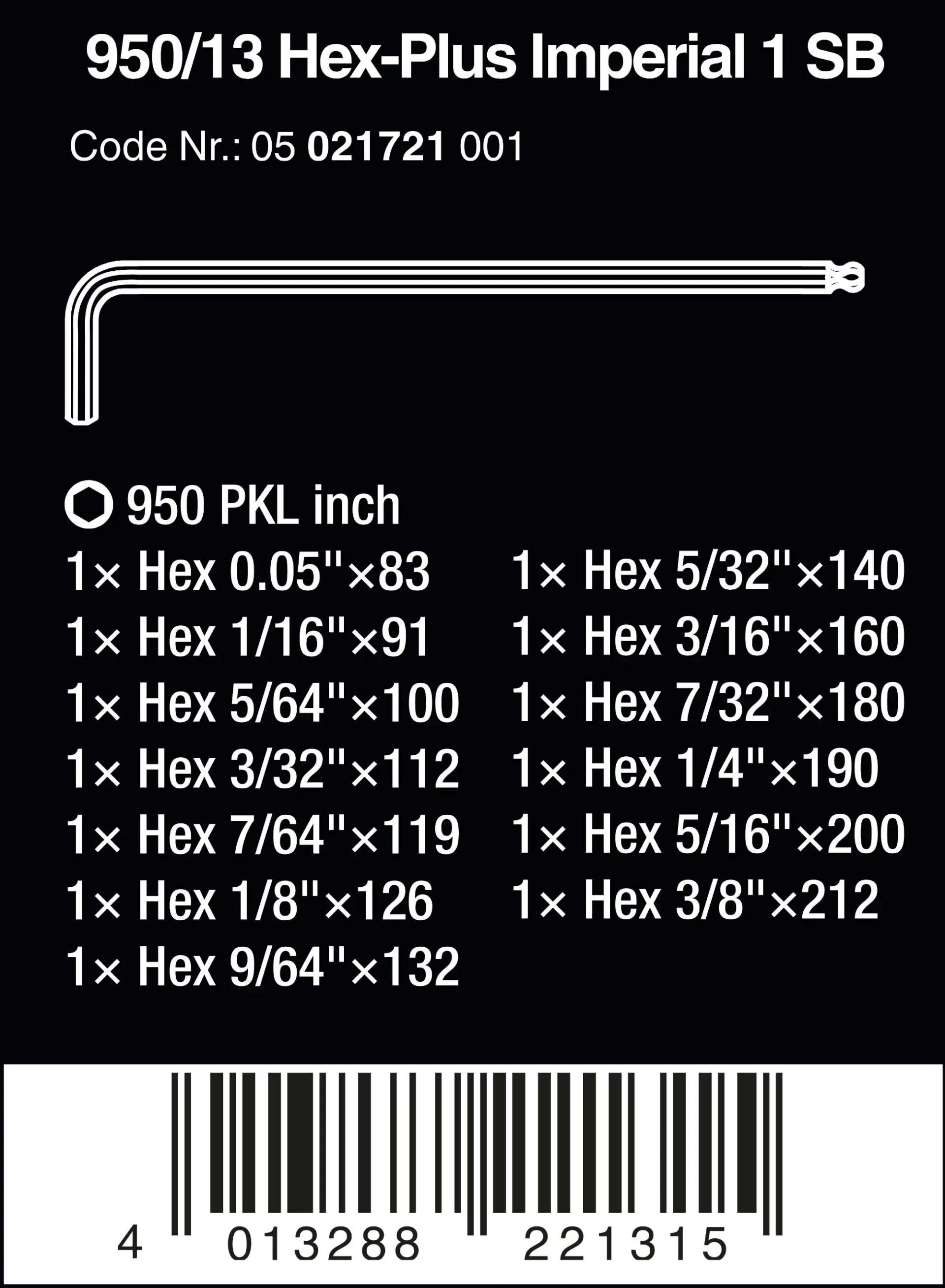 po 1 ks šesťhranný zástrčný kľúč 950 PKL Inch SW 0,05“ x 83 1) - 1/16“ x 91 1) - SW 5/64“ x 100 - SW 3/32“ x 112 - SW 7/64“ x 119 - SW 1/8“ x 126 - SW 9/64“ x 132 - SW 5/32“ x 140 - SW 3/16“ x 160 - SW 7/32“ x 180 - SW 1/4“ x 190 - SW 5/16“ x 200 - SW 3/8“ x 212 mm