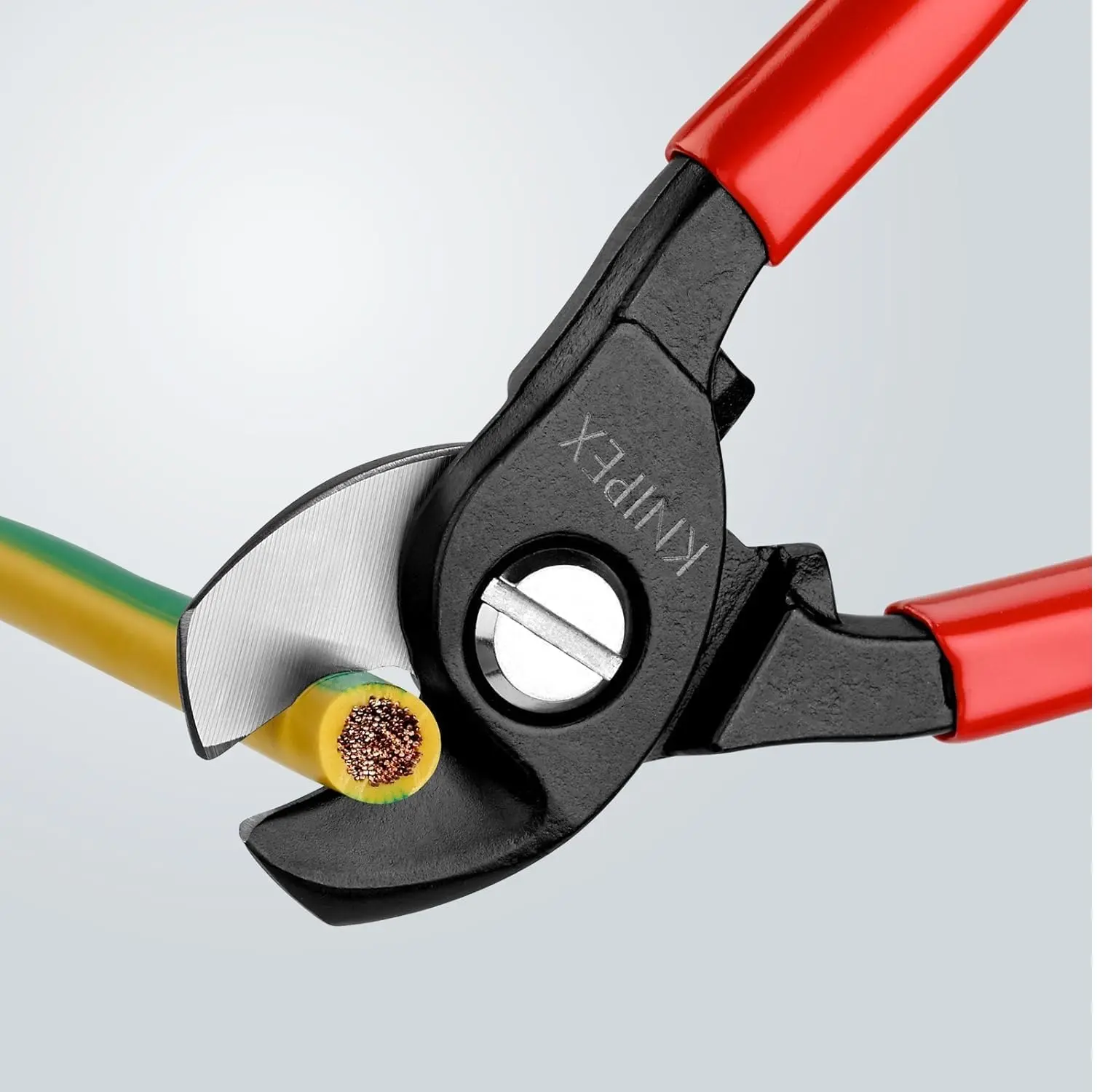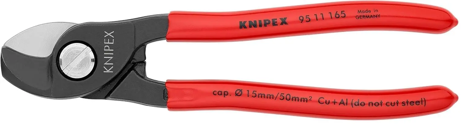 Káblové nožnice KNIPEX 95 11 165 s leštenou hlavou a plastovými puzdrami umožňujú presné rezanie medených a hliníkových káblov s priemerom do 15 mm. Ergonomické rukoväte zabezpečujú pohodlné uchopenie pri práci.