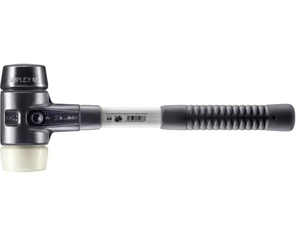 SIMPLEX-kladivo s kombináciou vložiek z gumového kompozitu (čierna, stredne tvrdá, tlmiaca, pachovo neutrálna, odolná proti opotrebovaniu) / nylonu (biela, tvrdá, veľmi odolná proti opotrebeniu, žiadne vyštipnutie aj pri teplotách pod bodom mrazu, odolná proti olejom a tukom)