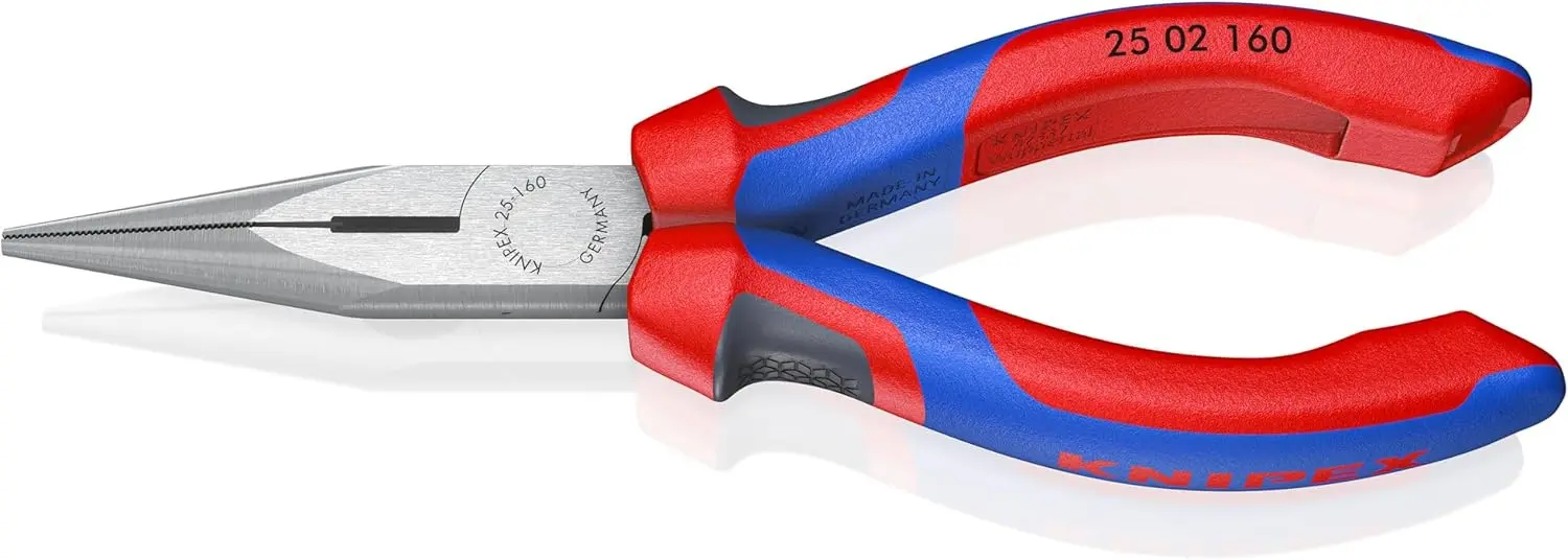 Půlkulaté kleště KNIPEX 25 02 160 s leštěnou hlavou a vícesložkovými návleky umožňují přesné uchopení i stříhání vodičů v radiotechnice díky břitům a délce 160 mm.