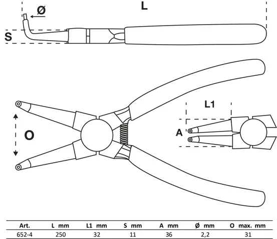 Kliešte na rozperné krúžky zahnuté pre vnútorné rozperné krúžky 250 mm (BGS100652-4)