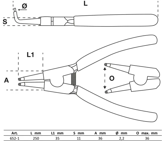 Zahnuté kleště na vnější rozpěrné kroužky o délce 250 mm umožňují přesnou manipulaci i v hůře přístupných místech. Ergonomická rukojeť zajišťuje pevný úchop při práci.