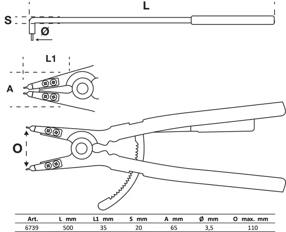Kleště na rozpěrné kroužky zahnuté pro vnější kroužky s délkou 500 mm umožňují přesnou manipulaci i v hůře přístupných místech. Ergonomická rukojeť zajišťuje pevný úchop při práci.