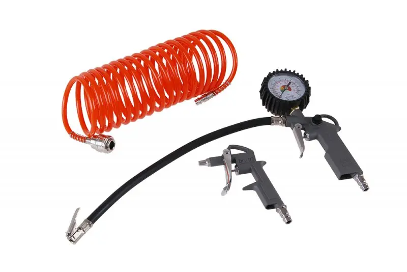 Súčasťou balenia je pištoľ na hustenie pneumatík s manometrom, ktorý umožňuje presné meranie tlaku a jednoduché hustenie. Súprava obsahuje aj fúkaciu pištoľ, ktorá je vhodná na odstraňovanie prachu a nečistôt z ťažko prístupných miest. Tretím prvkom je špirálová hadica, ktorá poskytuje flexibilné spojenie medzi kompresorom a náradím.