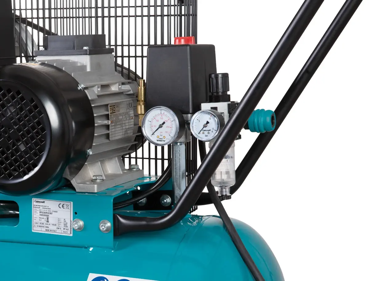 Stroj je vybavený bezpečnostným ventilom a manometrom na kontrolu tlaku, čo prispieva k bezpečnej prevádzke. Stabilný podvozok s kolieskami uľahčuje presun kompresora na požadované miesto. Konštrukcia je navrhnutá tak, aby bola trvanlivá a odolná voči bežnému opotrebovaniu.