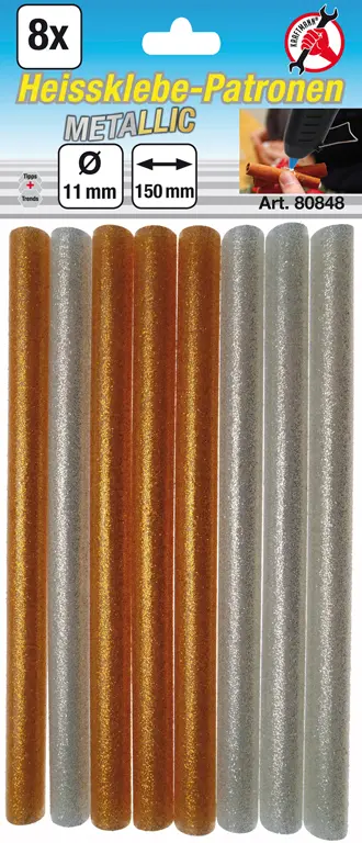Sada osmi metalických tavicích patron Kraftmann 11 x 150 mm je vhodná pro lepení, dekorace i opravy, kompatibilní s většinou tavných pistolí. Patrony mají univerzální rozměr a snadno se používají.