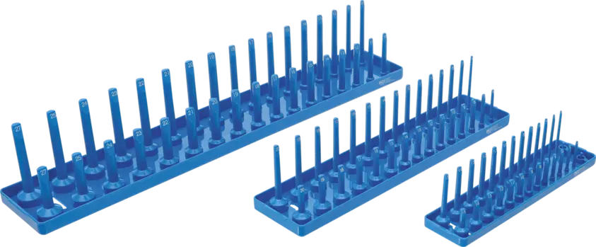 Sada tří držáků BGS1067158 umožňuje přehledné uložení nástrčných hlavic, každý držák je určen pro jinou velikost a zajišťuje snadný přístup při práci. Kompatibilita s běžnými rozměry hlavic usnadňuje organizaci v dílně.