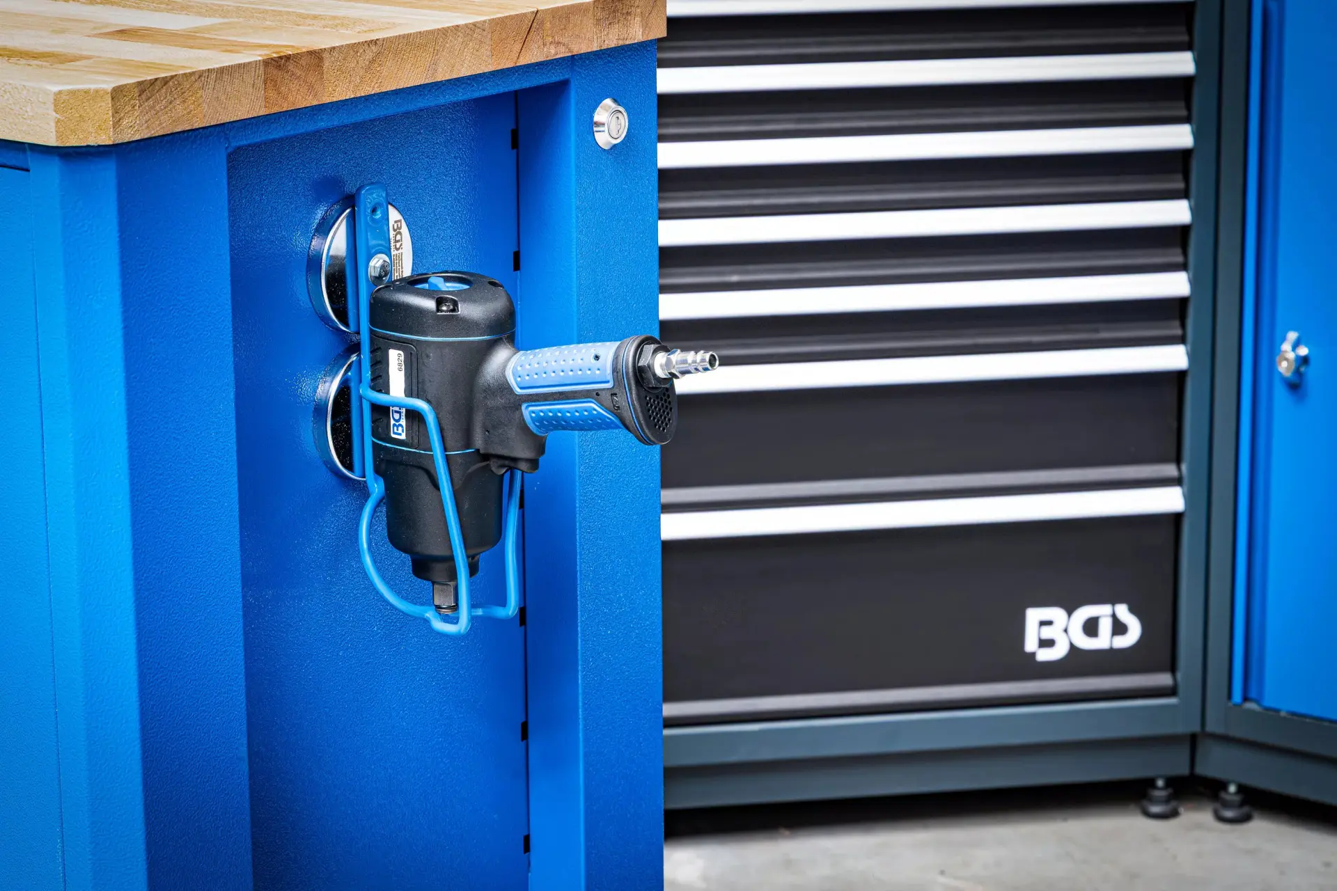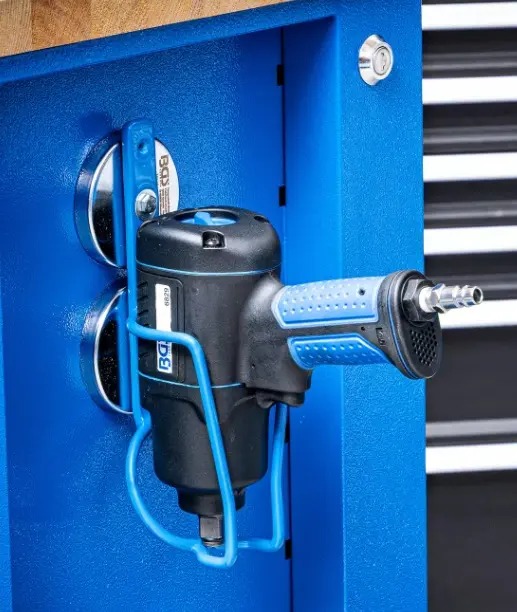 Držiak ktorý umožňuje rýchle uchytenie, zavesenie náradia na kovové povrchy a zvyšuje poriadok aj dostupnosť v dielni. Kompatibilný s väčšinou bežných vzduchových uťahovákov, vŕtačiek.