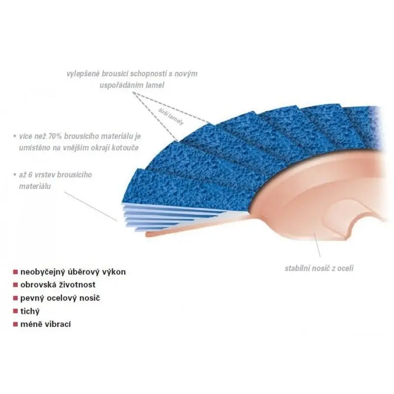 - Lamelový brúsny kotúč s oceľovým nosičom a extrémne odolným zrnom na rýchle agresívne brúsenie bežných ocelí, ale aj hliníka s dlhšou životnosťou v porovnaní so štandardnými lamelovými kotúčmi