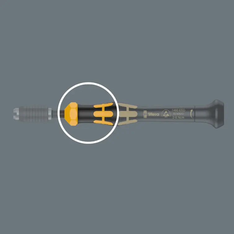Nastaviteľné momentové skrutkovače elektrostaticky bezpečné radu Kraftform 7400 ESDs rýchloupínacou hlavou na použitie v elektronike. Prednastavené hodnoty uťahovacieho momentu (0,035 a 0,050 Nm).