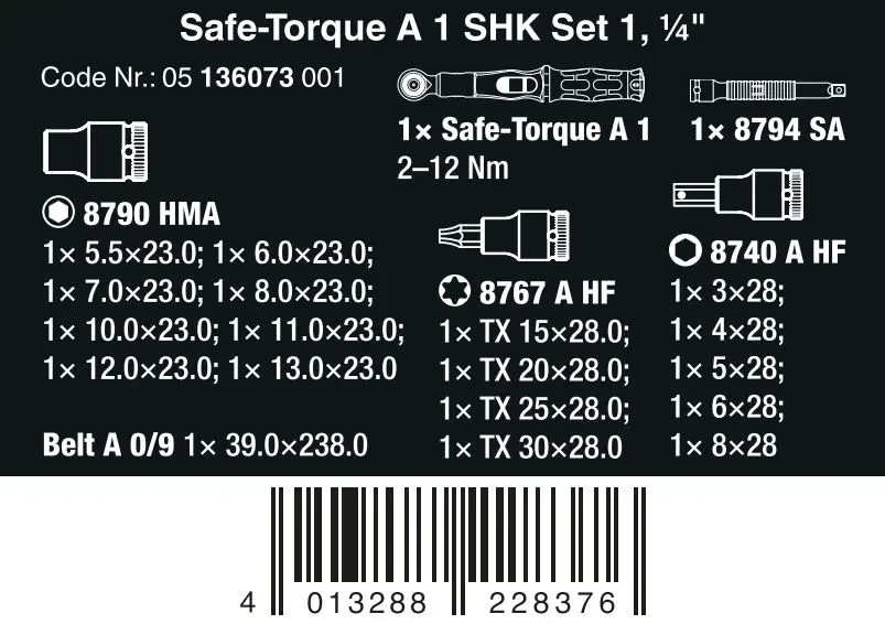 Wera 136073 Momentový kľúč Safe-Torque A 1 SHK Set 1, štvorhran 1/4", 2 ÷ 12 Nm (Sada 20 dielov) (W05136073001)