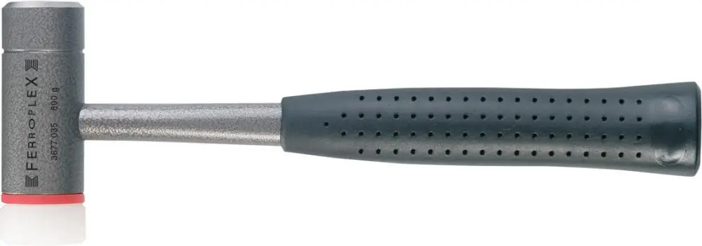 Prevedenie: Teleso kladiva z kvalitnej ocele k zušľachteniu, čelo dôkladne tvrdené a zušľachtené. Jedna strana s nylonovou vložkou bez obsahu kadmia, vymeniteľná, druhá strana z vysoko hodnotnej kalenej ocele. S nerozebratelnou rukoväťou z oceľovej rúrky a gumovým púzdrom rukoväte.