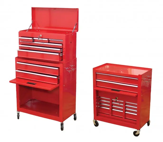 Vozík je vybavený viacerými odkladacími policami, ktoré poskytujú dostatok priestoru pre rôzne náradie, diely a príslušenstvo. Vďaka vysokej konštrukcii je možné využiť vertikálny priestor a mať všetko potrebné vždy po ruke. Každá polica je ľahko prístupná, čo urýchľuje prácu a zvyšuje prehľadnosť uložených predmetov.