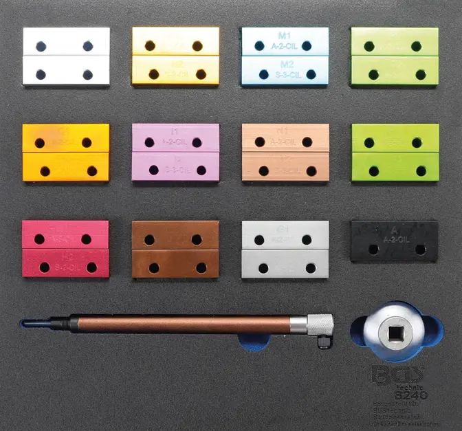 Souprava nářadí BGS108240 umožňuje přesné nastavení časování motoru u vozů Fiat, Lancia a Alfa Romeo, obsahuje speciální přípravky pro různé typy motorů. Vhodná pro profesionální i domácí použití při údržbě a opravách.