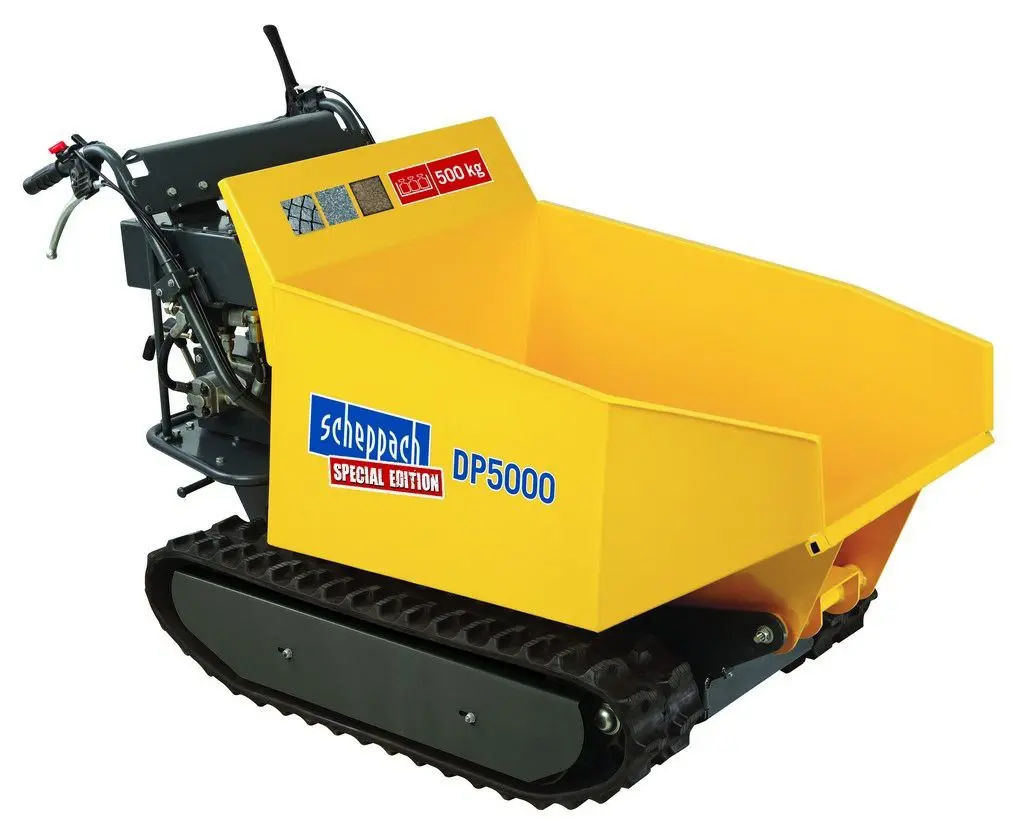 Pásový přepravník Scheppach DP 5 000 (500 kg) s hydraulickým sklápěním korby - Umožňuje snadnou přepravu pevných a sypkých materiálů až do hmotnosti 500 kg i do špatně přístupných míst - Vhodný pro přepravu zeminy, písku, štěrku, kamenů, dlažb