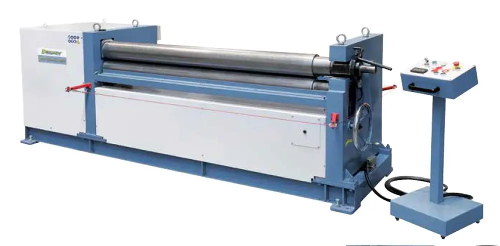 - Výkon motora [W]: 5 500 - Napájacie napätie [V/Hz]: 400/50 - Maximálna šírka dosky [mm]: 3 050 - Priemer valca [mm]: 170 - Predohyb [mm]: 2,5 - Maximálna hrúbka plechu [mm]: 3,5 - Minimálny priemer závesu [mm]: 260 - Rýchlosť valca [U.min-1]: 9 - Rozmery stroja (d x š x v) [mm]: 4 520 x 1 410 x 1 170 - Hmotnosť [kg]: 3 455 Bernardo MPR 3050 - 3,5 MD sústruh na plech Nový rad ohýbačiek plechu Bernardo MPR s motorickým pohonom valcov a mobilným nožným ovládaním. - Pevná, veľmi stabilná liatinová konštrukcia - Asymetricky nastaviteľné valce na jednoduché predohýbanie -- - Ľahko a nezávisle nastaviteľné zadné a spodné valce umožňujú kónické zakrivenie - 3 drážky na spodných a zadných valcoch na kruhové ohýbanie -- - Pohyblivý nožný ovládač na zmenu smeru otáčania valcov - Horný naklápací valec umožňuje jednoduché vybratie hotového dielu - Horný a zadný valec sú ručne nastaviteľné pomocou ručného kolieska