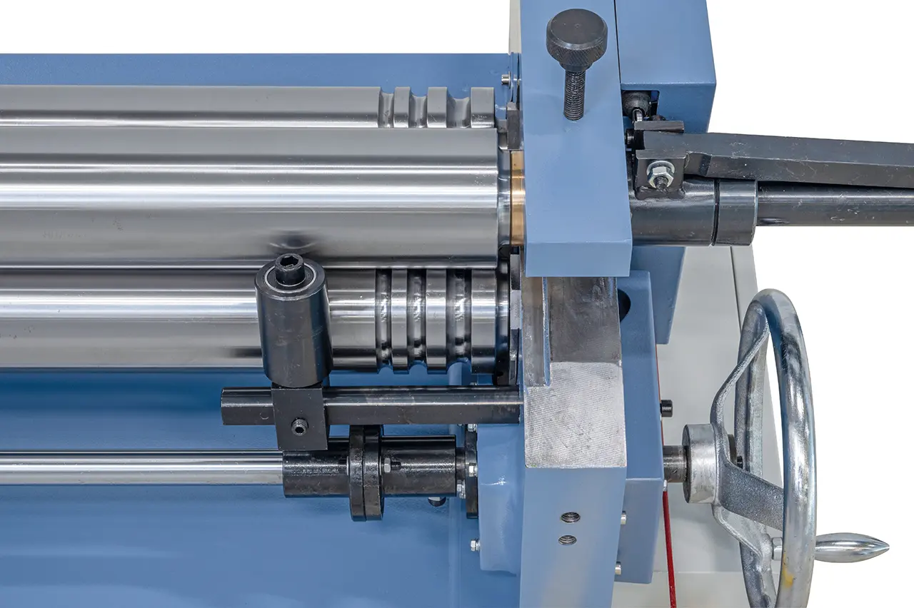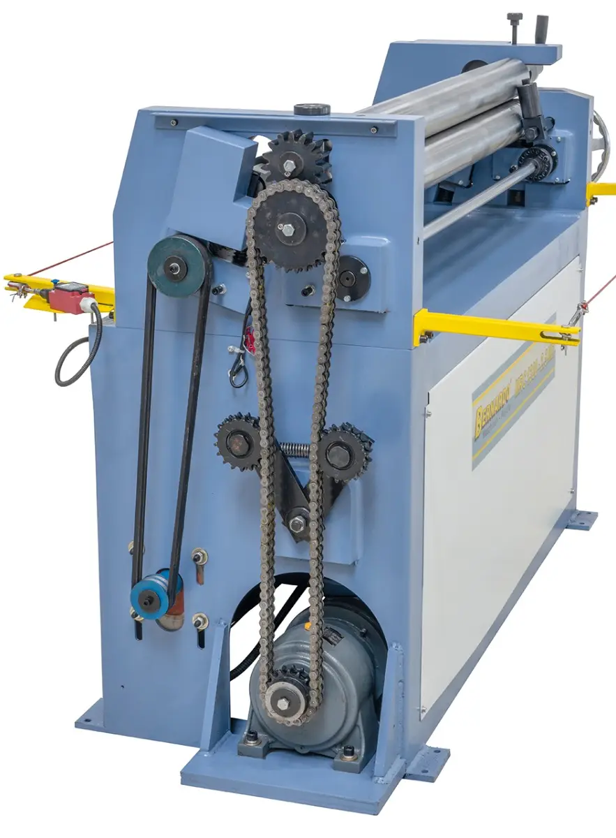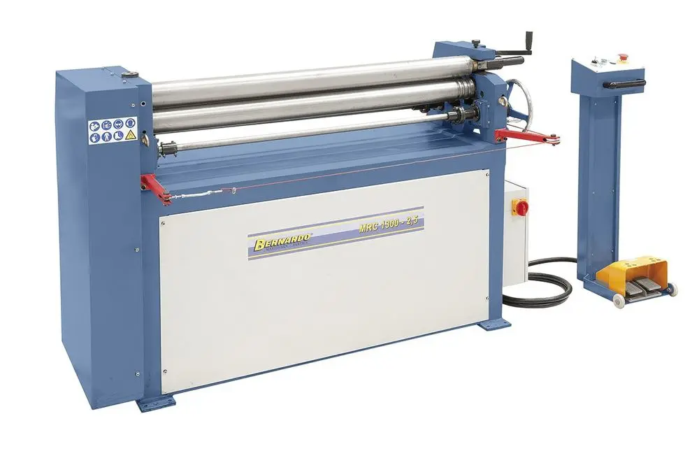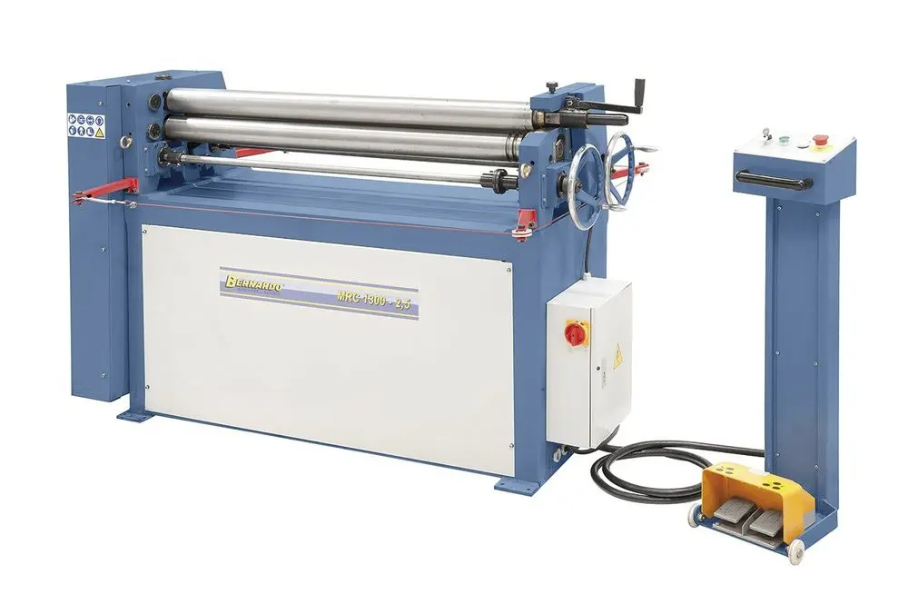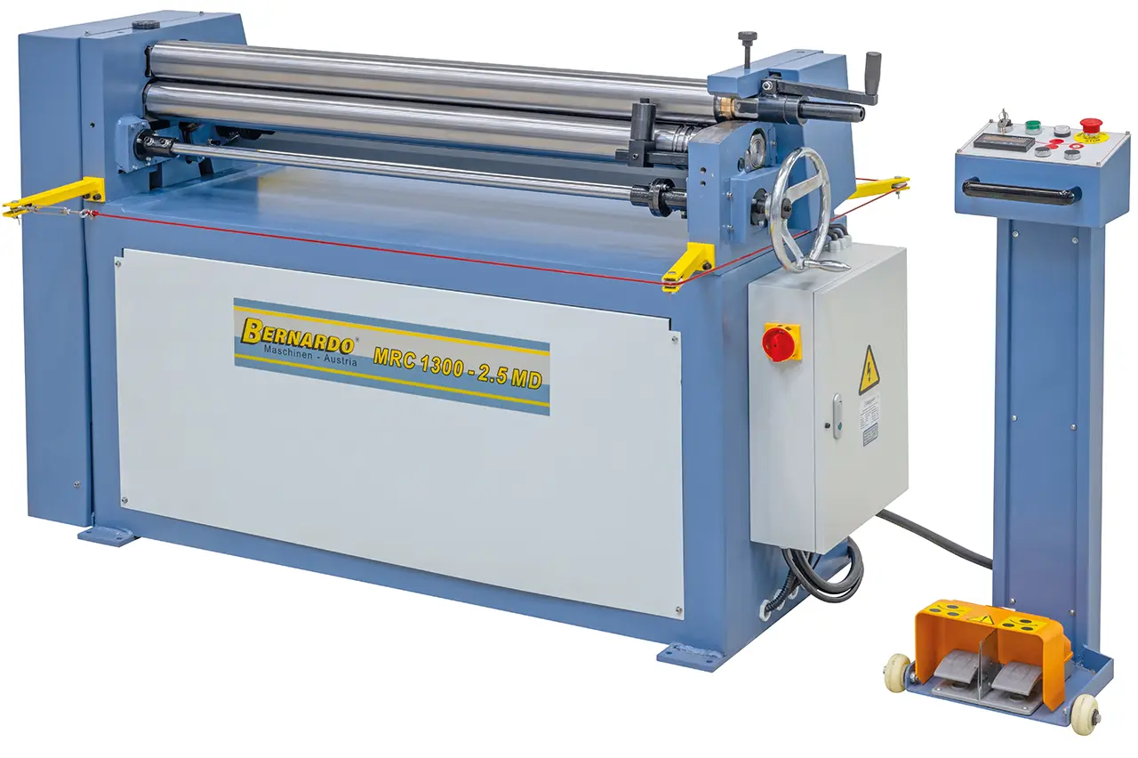 motor 1,1 kW, napätie 400 V, priemer. valce 90 mm, šírka plechu 1300 mm, hr. plechu 2,5 mm, min. pr. zakrúženie 135 mm, otáčky valcov 12 U.min-1, rozmery 1850 × 1040 × 1280 mm
