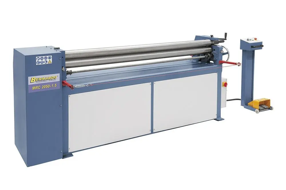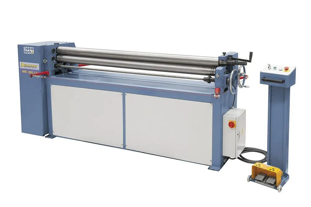 motor 1,1 kW, napětí 400 V, pr. válce 90 mm, šířka plechu 1050 mm, tl. plechu 3,0 mm, min. pr. zakroužení 135 mm, otáčky válců 12 U.min-1, rozměry 1610 × 1030 × 1150 mm