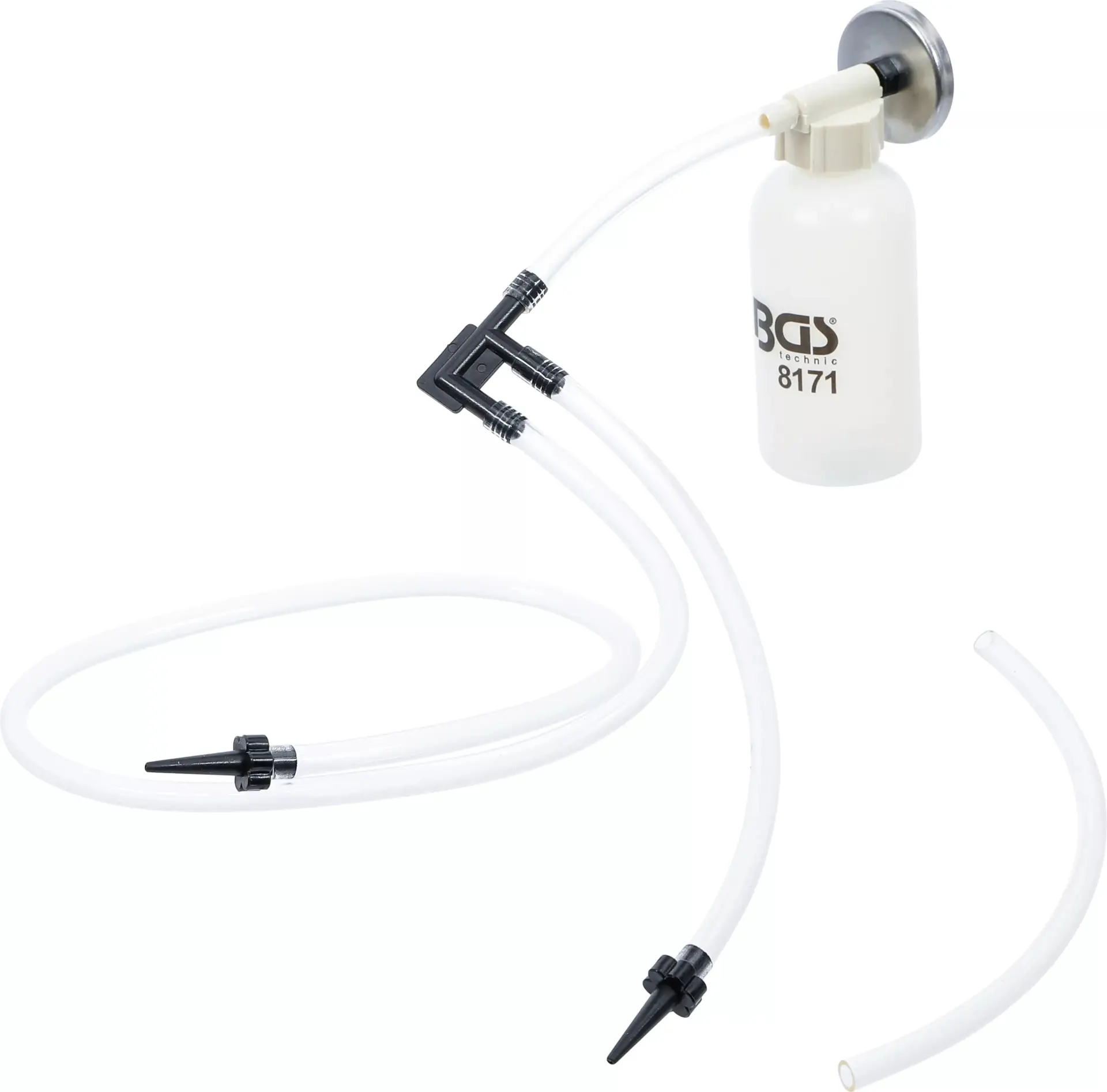Nádoba BGS108171 je určena pro odvzdušnění brzd a spojky motocyklů, disponuje praktickým háčkem pro zavěšení a objemem 250 ml. Průhledné provedení umožňuje snadnou kontrolu hladiny kapaliny během práce.