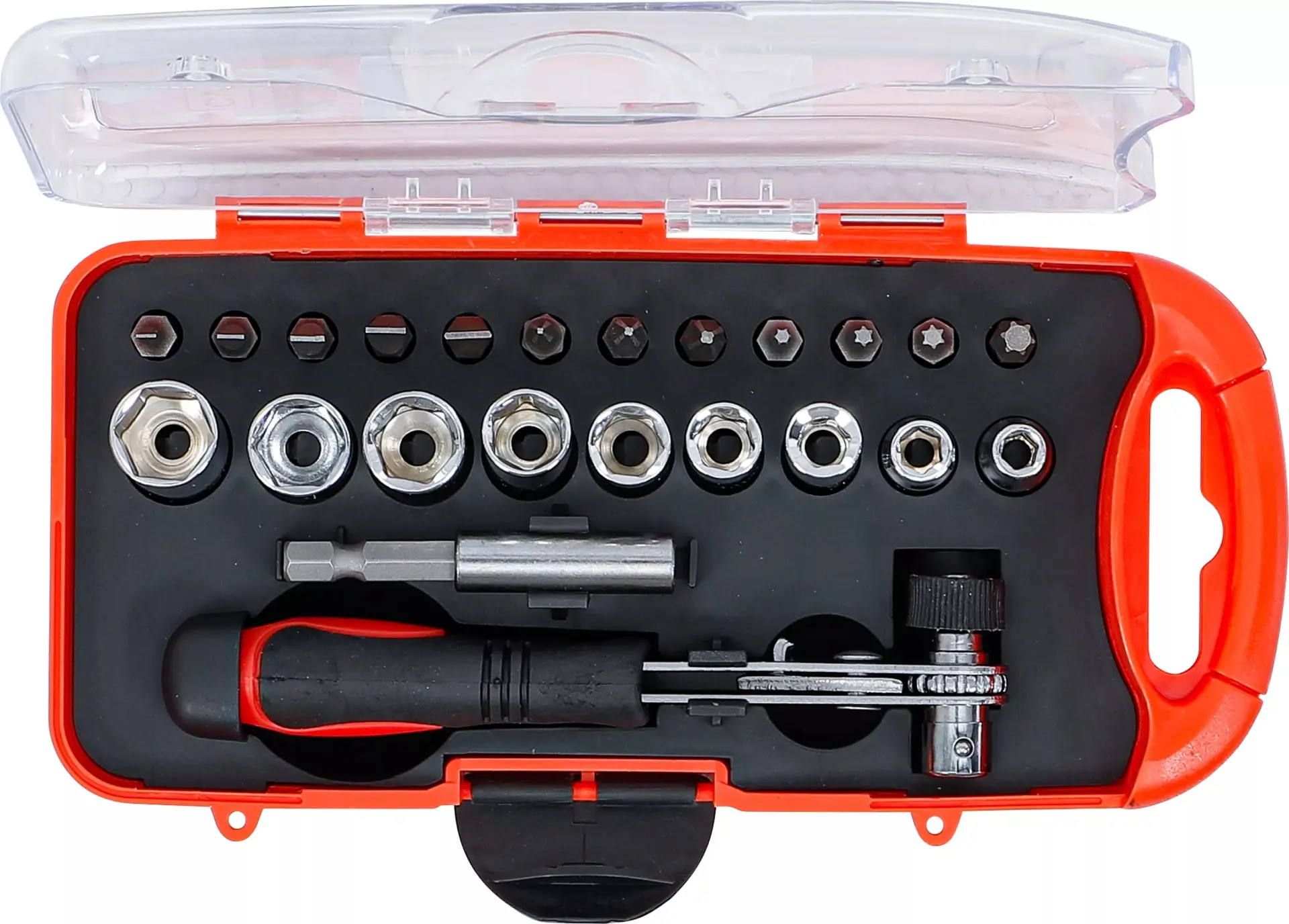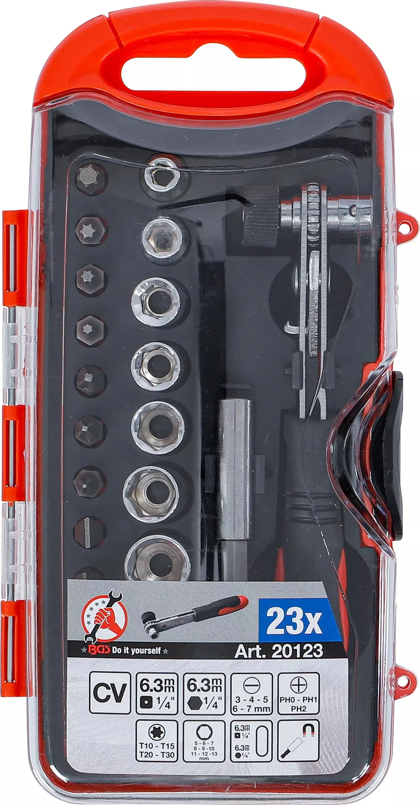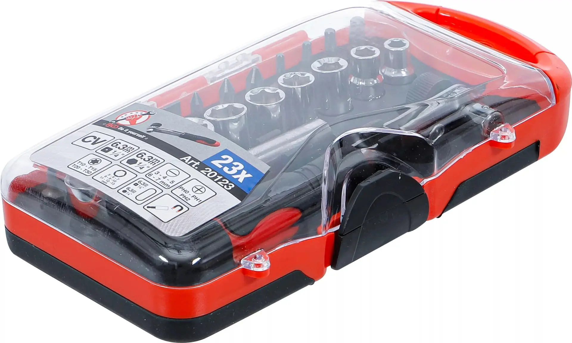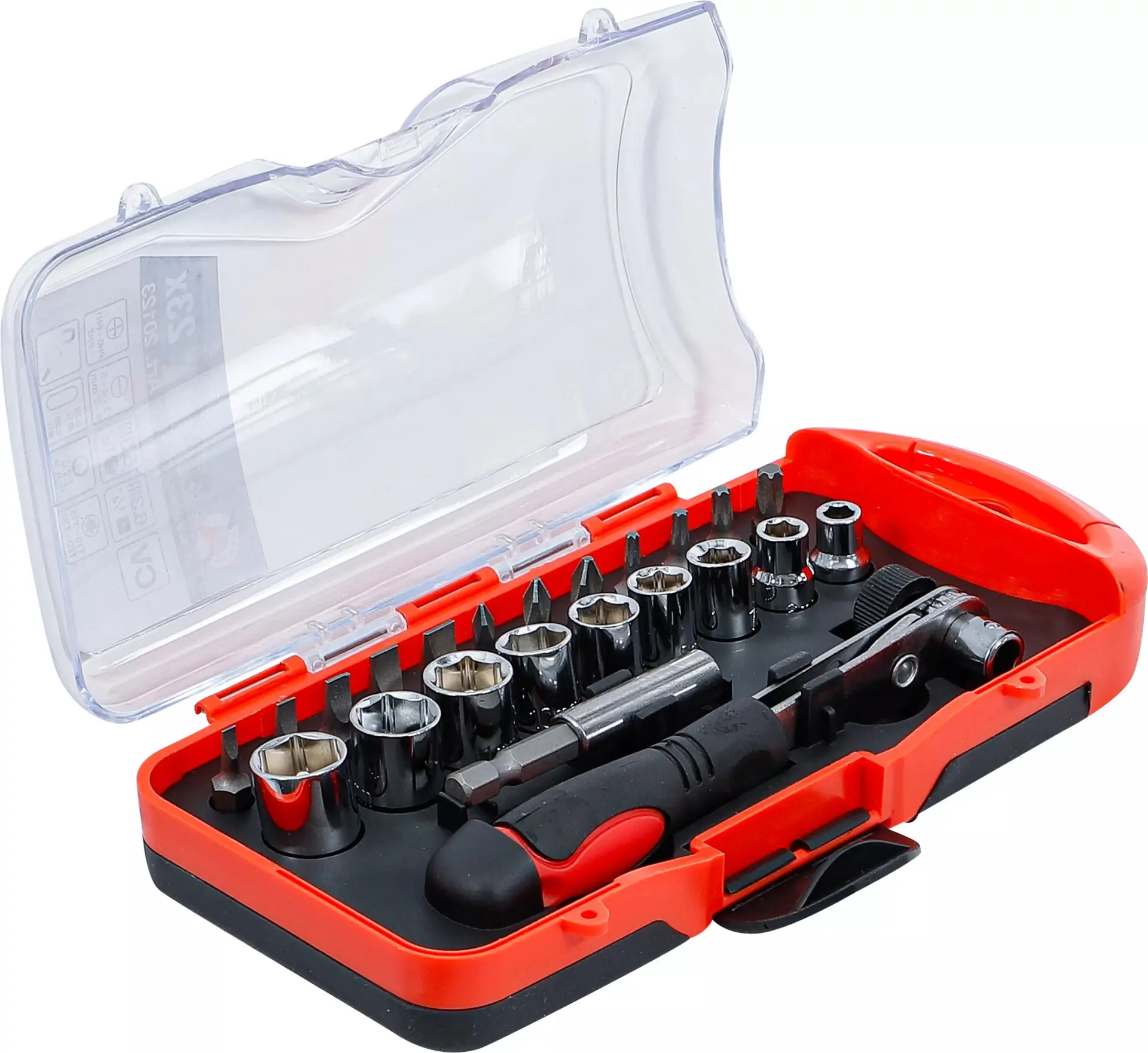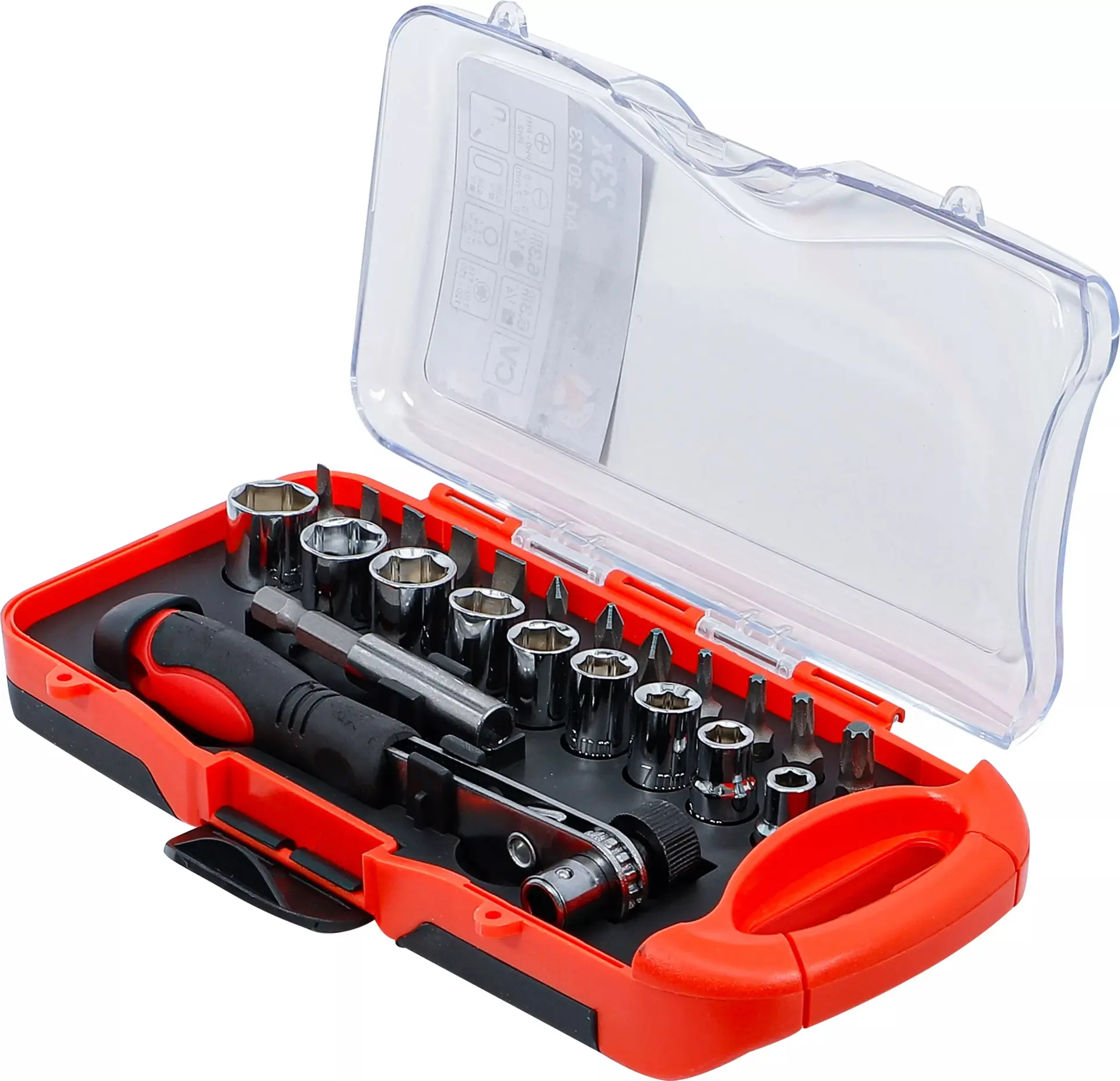 Sada obsahuje 23 dílů včetně ráčny 1/4", nástrčných hlavic a bitů, které pokryjí běžné potřeby při montáži a opravách. Kompaktní balení usnadňuje přenášení i skladování.