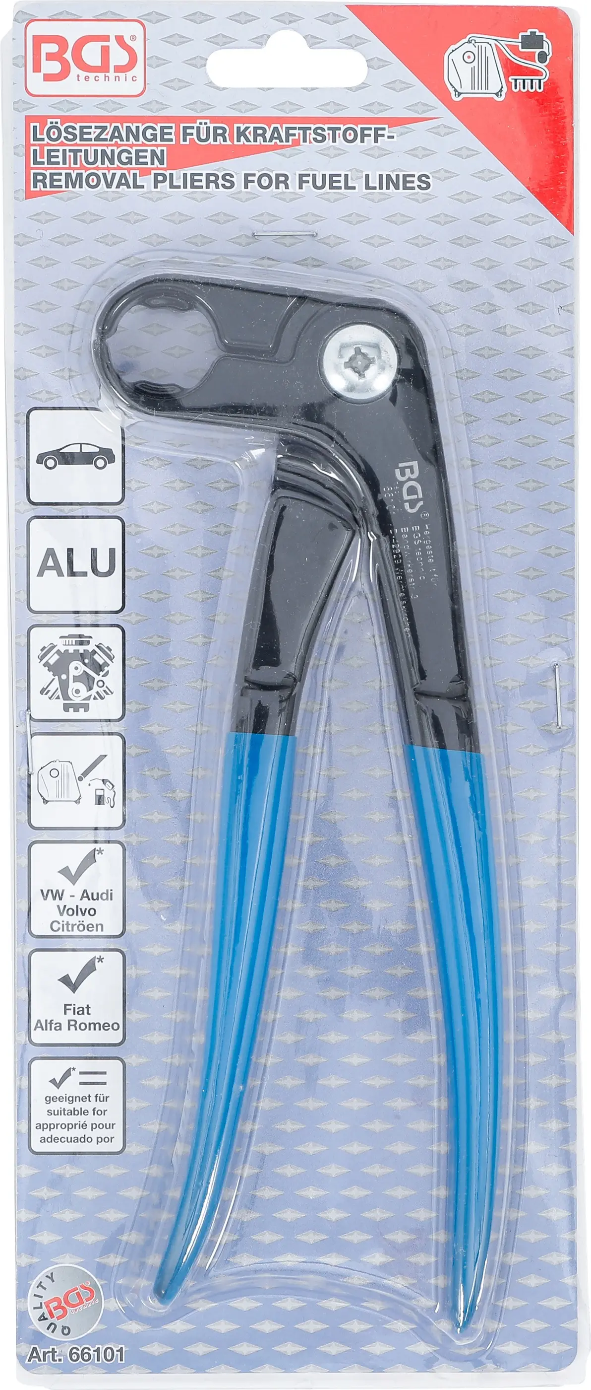 Kleště na rozpojení palivových rychlospojek BGS1066101 umožňují snadné oddělení rychlospojek palivových vedení bez poškození dílů. Ergonomická rukojeť zajišťuje pevný úchop při práci.