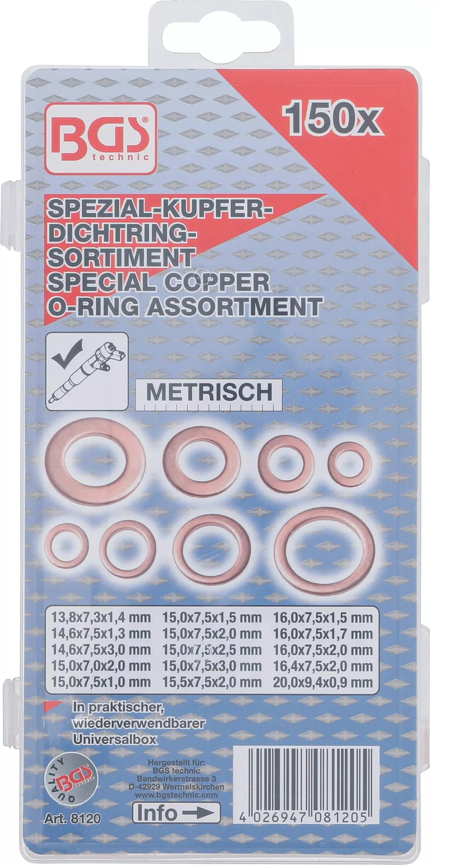 Sada 150 měděných podložek BGS108120 obsahuje rozměry od 13,8 do 20,0 mm, vhodné pro těsnění a opravy v automobilovém i strojírenském prostředí. Měď zajišťuje odolnost vůči korozi a vysokým teplotám.