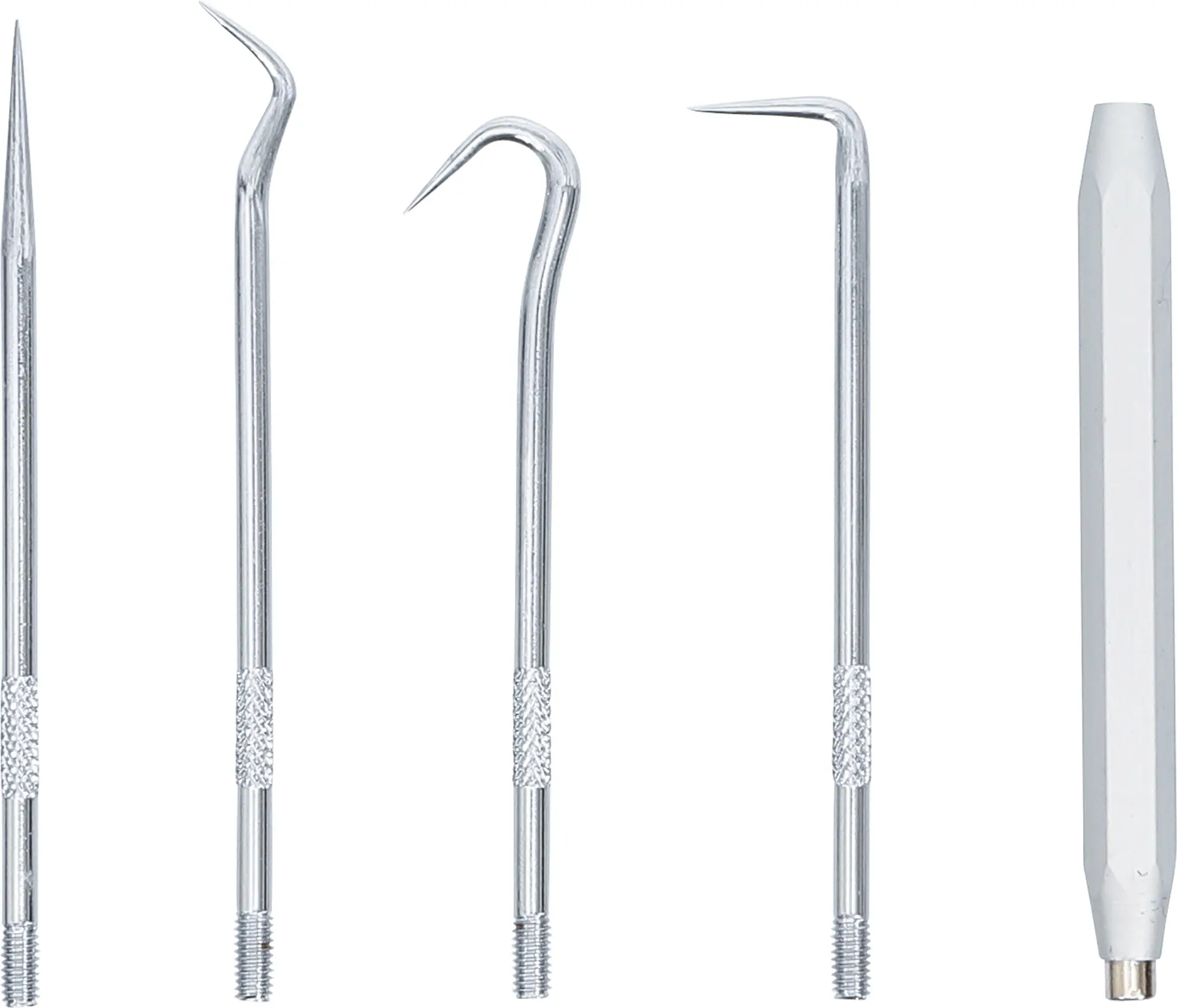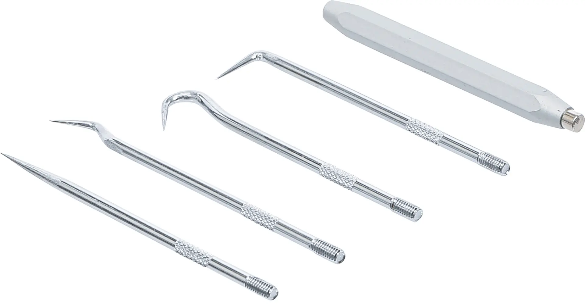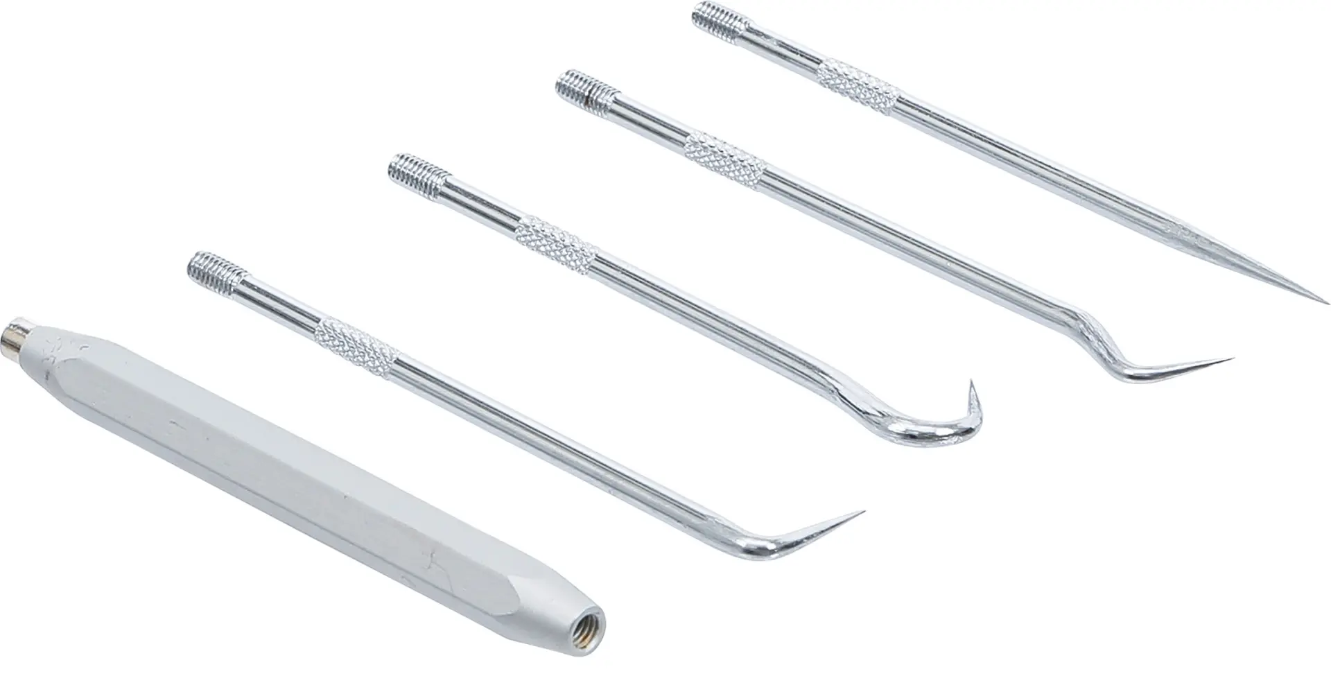 Sada pěti montážních háčků BGS108035 je určena pro snadné nasazování a sejmutí "O" kroužků, těsnění a pružin v těžko přístupných místech. Ergonomické rukojeti zajišťují pevný úchop při práci v dílně i garáži.