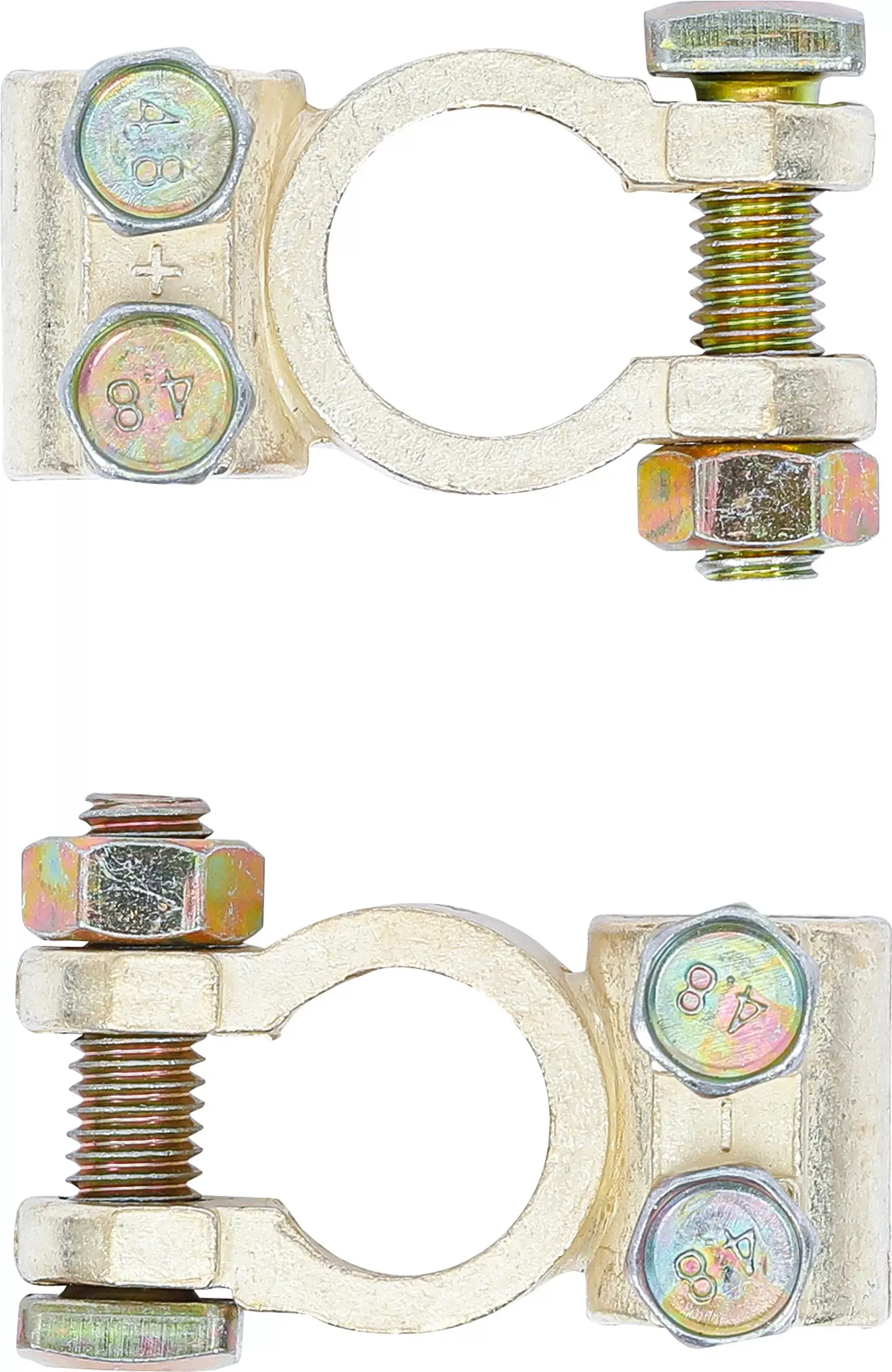 Sada obsahuje jeden pár kulatých mosazných svorek BGS101408 pro akumulátor, které zajišťují pevné spojení a odolnost proti korozi. Vhodné pro běžné automobilové baterie.