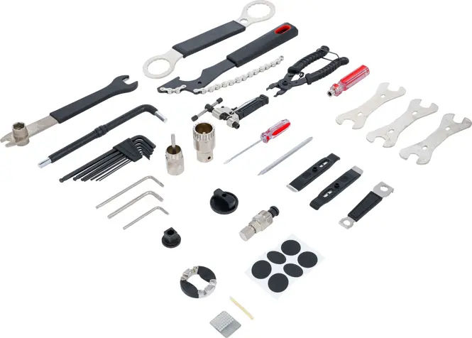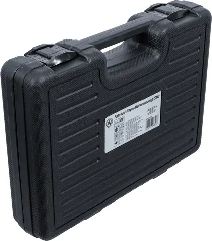 Sada 32 dílů Kraftmann BGS1090100 obsahuje nástroje pro údržbu a opravy jízdního kola, včetně klíčů, stahováků a montážních pomůcek. Vše je přehledně uloženo v praktickém kufříku.