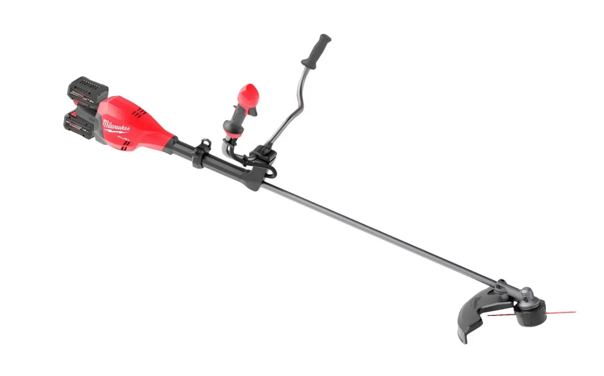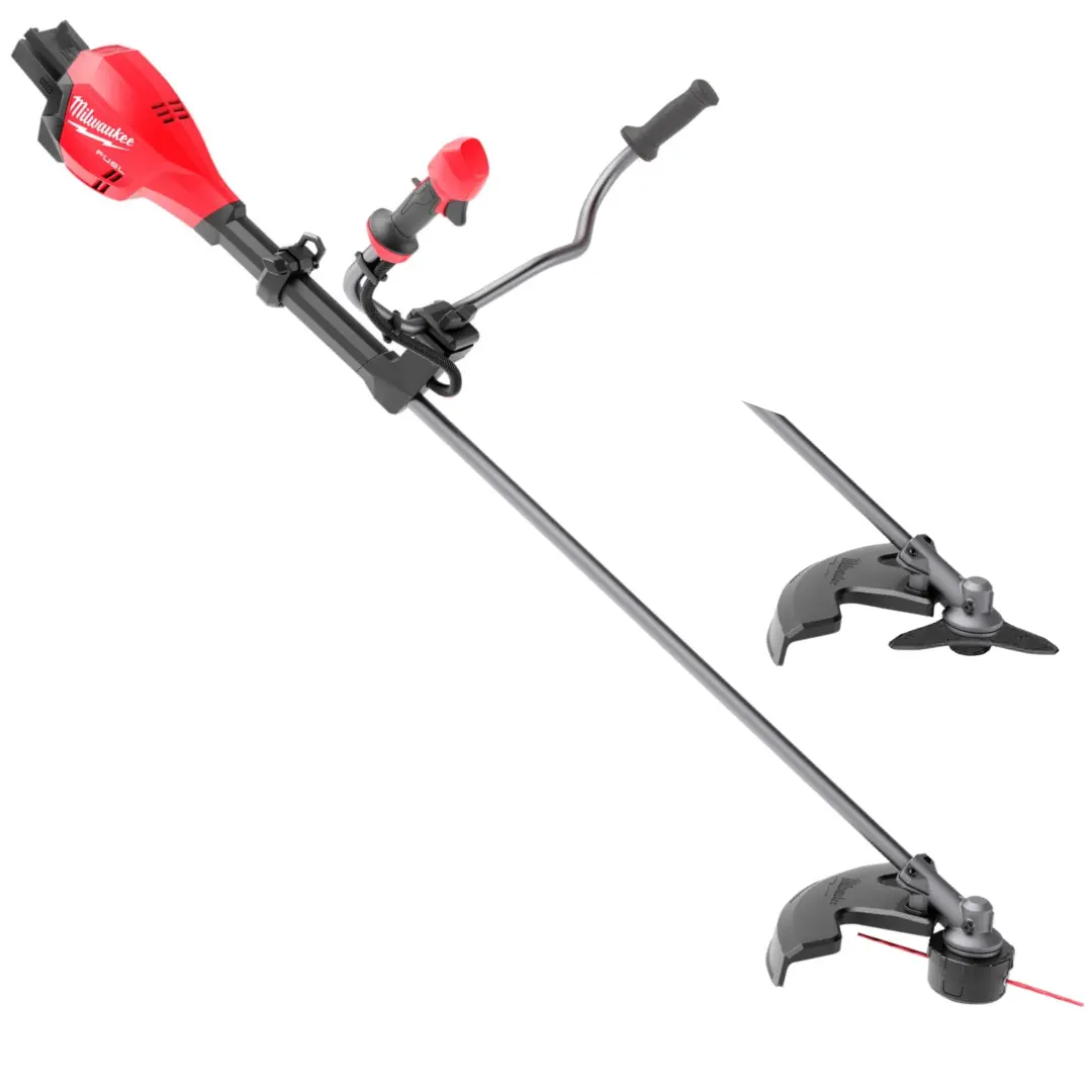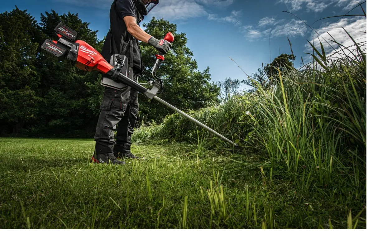 Akumulátorová strunová sekačka na trávu Milwaukee M18 F2BCU-0. Zahradní nářadí s vyměnitelným nástavcem: strunový vyžínač / 3-břitý křovinořez, záběr struny 38-43 cm, vyměnitelná žací struna o průměru 2 mm, vyměnitelný žací tříbřitý nůž se záběrem 26
