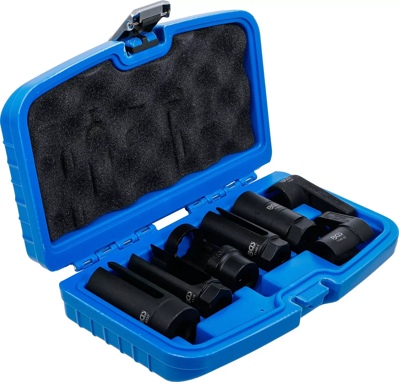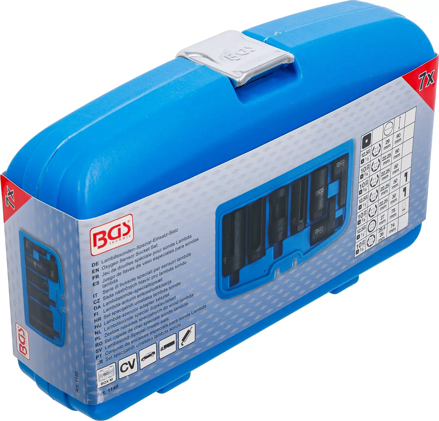 Sada sedmi nástrčných hlavic 3/8" a 1/2" BGS101140 je určena pro demontáž lambda sond, obsahuje různé velikosti pro široké využití v autoservisu. Robustní konstrukce zajišťuje dlouhou životnost při práci s pevně usazenými díly.