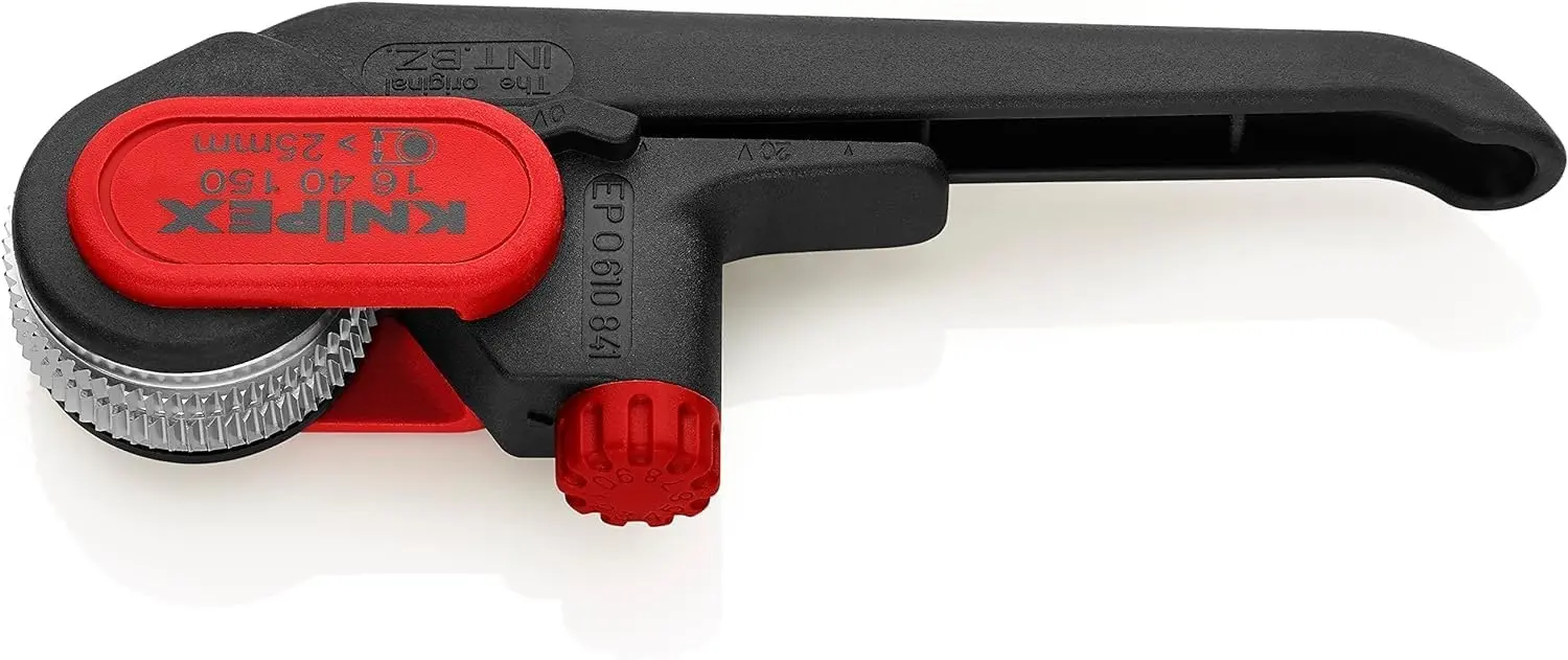 Nástroj na odstraňovanie plášťov Knipex 16 40 150 umožňuje presné a rýchle odstránenie izolácie z káblov s priemerom 4–16 mm bez poškodenia vodiča. Ergonomická rukoväť zaisťuje pohodlné držanie pri práci.