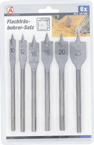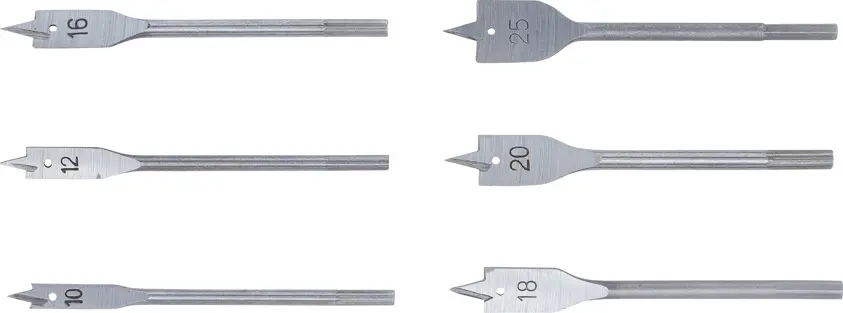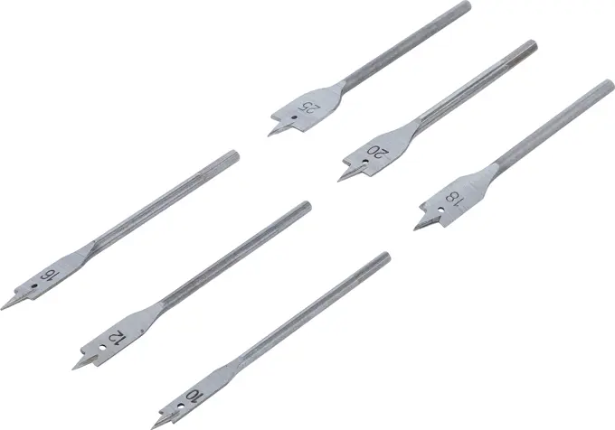 Sada plochých frézovacích vrtáků BGS 50796 obsahuje 6 kusů s průměry 10–25 mm, vhodných pro přesné vrtání do dřeva a měkkých materiálů. Praktické balení usnadňuje přenášení i skladování.