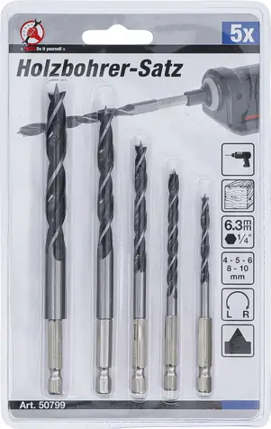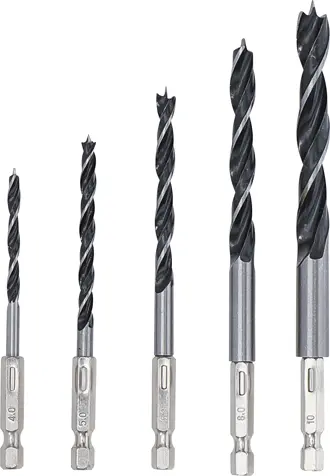 Sada obsahuje pět vrtáků do dřeva o průměrech 4–10 mm se šestihrannou stopkou, které usnadňují rychlou výměnu v upínacím systému. Vhodné pro přesné vrtání do dřeva v domácí dílně i na stavbě.