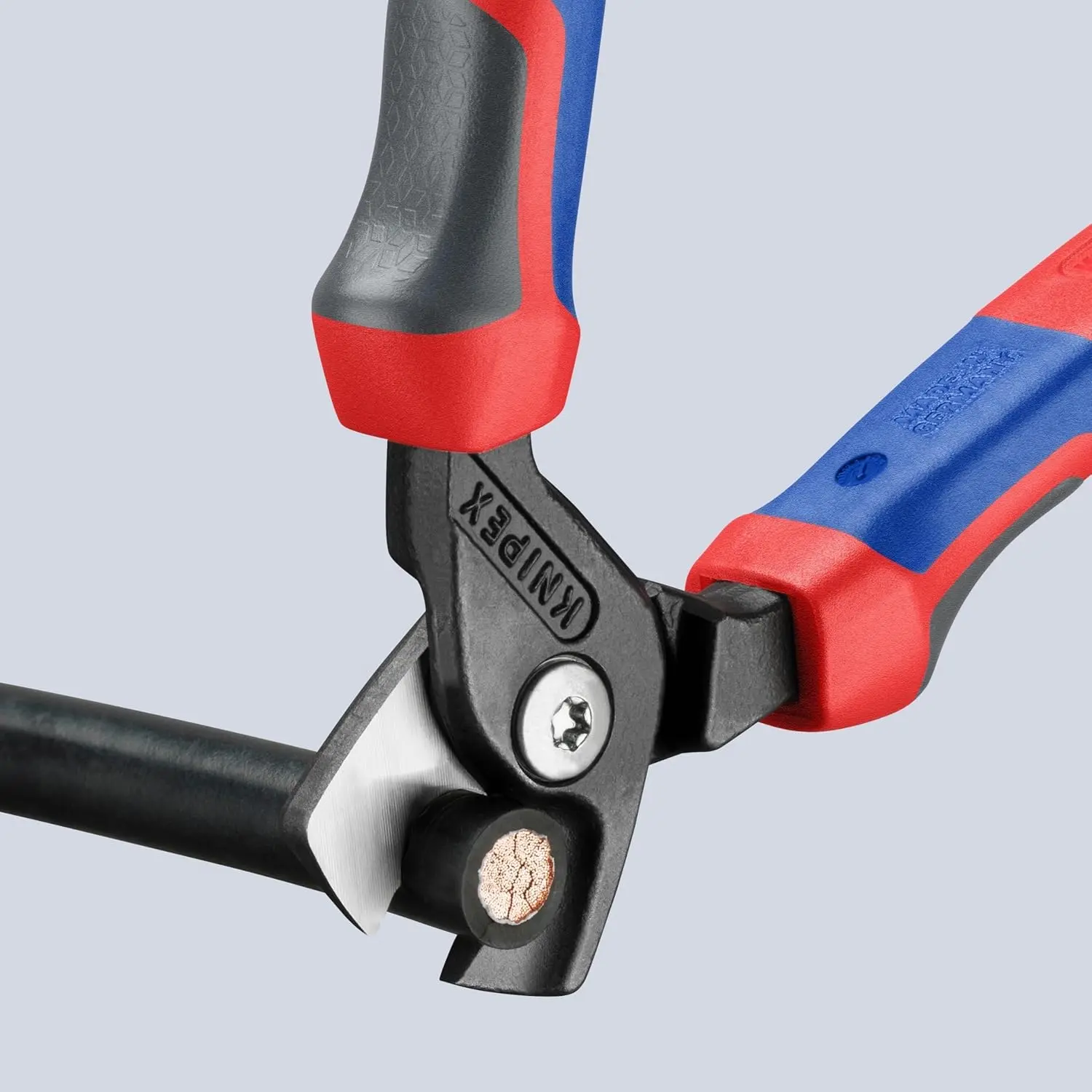 Nůžky na kabely KNIPEX K 95 12 160 SB jsou určeny pro stříhání měděných a hliníkových kabelů bez ocelového jádra. Díky speciálně tvarovaným břitům umožňují čistý a přesný řez bez deformace vodiče, což ocení každý, kdo pracuje s elektroinstalacemi nebo údržbou rozvodů.