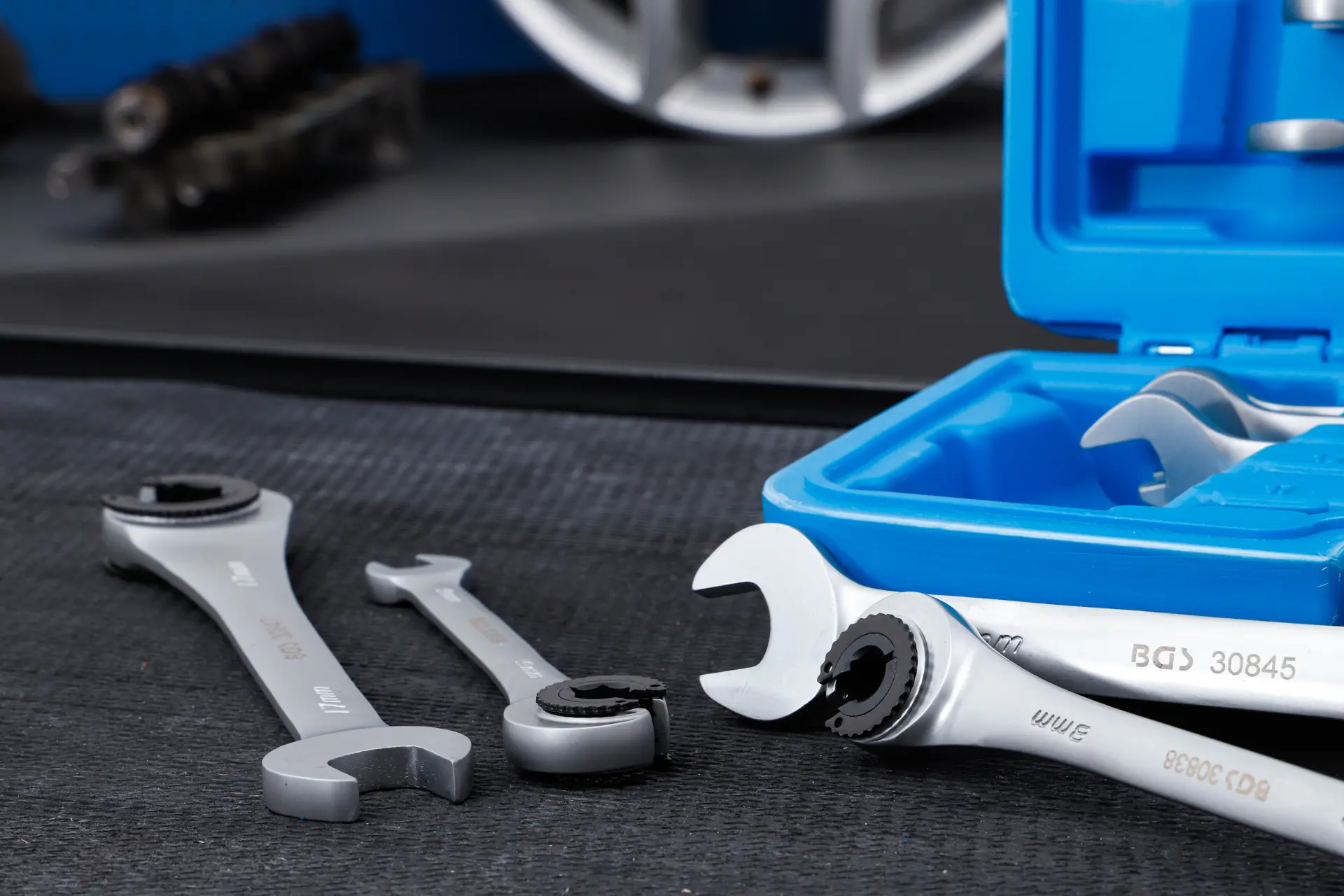 Otvorené očkoploché kľúče BGS technic s jemnou račňou - prevedenie pre prácu s potrubím a pre prevlečné matice.